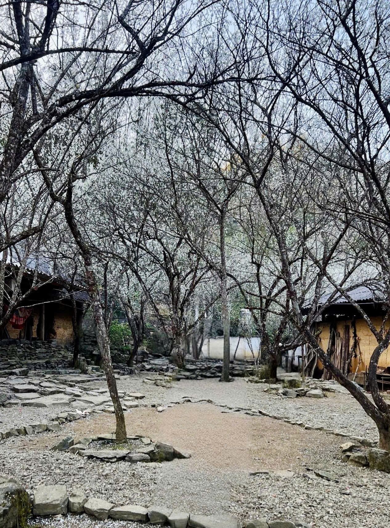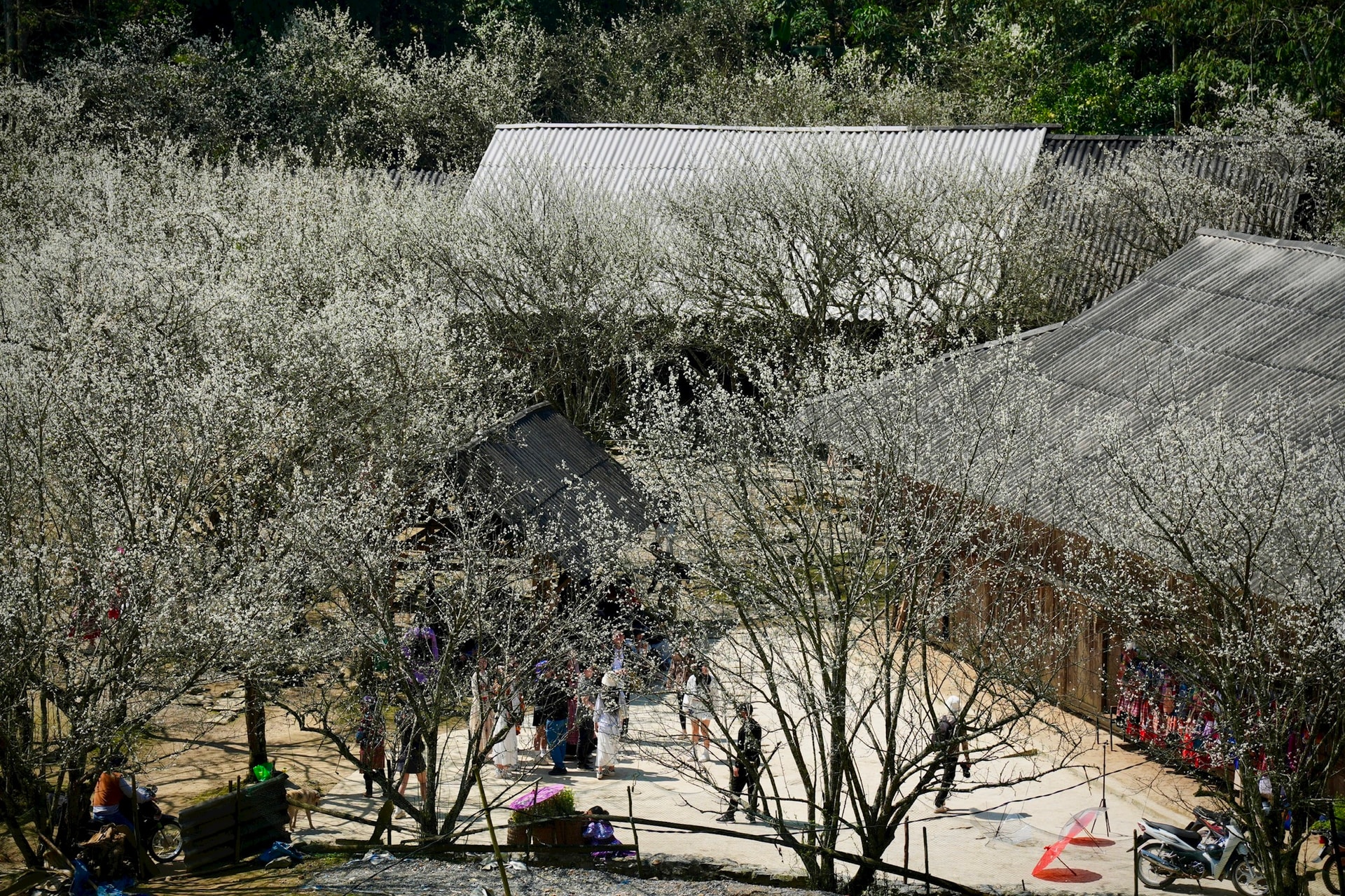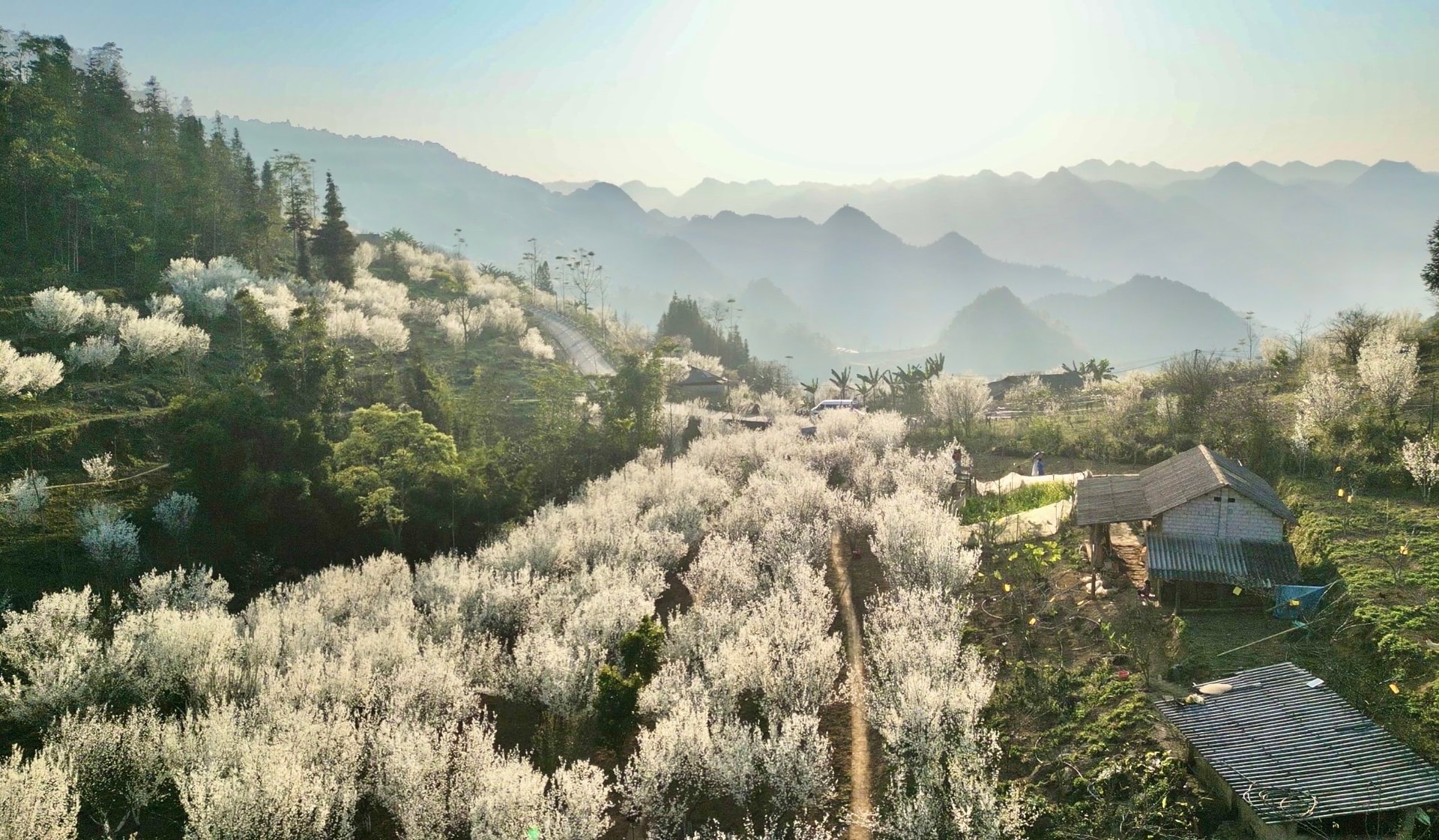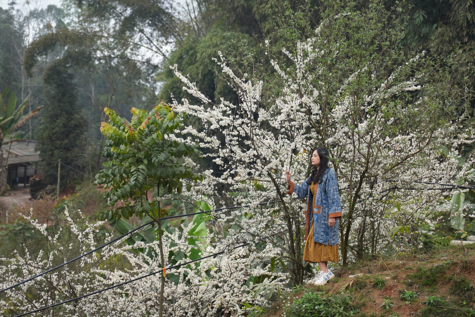 Người ta hay nhắc đến hoa mận Mộc Châu với những thung lũng trắng bạt ngàn, những vườn mận trải dài như thảo nguyên. Ở Bắc Hà, mận nở xen kẽ trong bản, bên những nếp nhà đá cũ, dọc sườn núi ẩn hiện trong mây. Ảnh: Oanh Đỗ