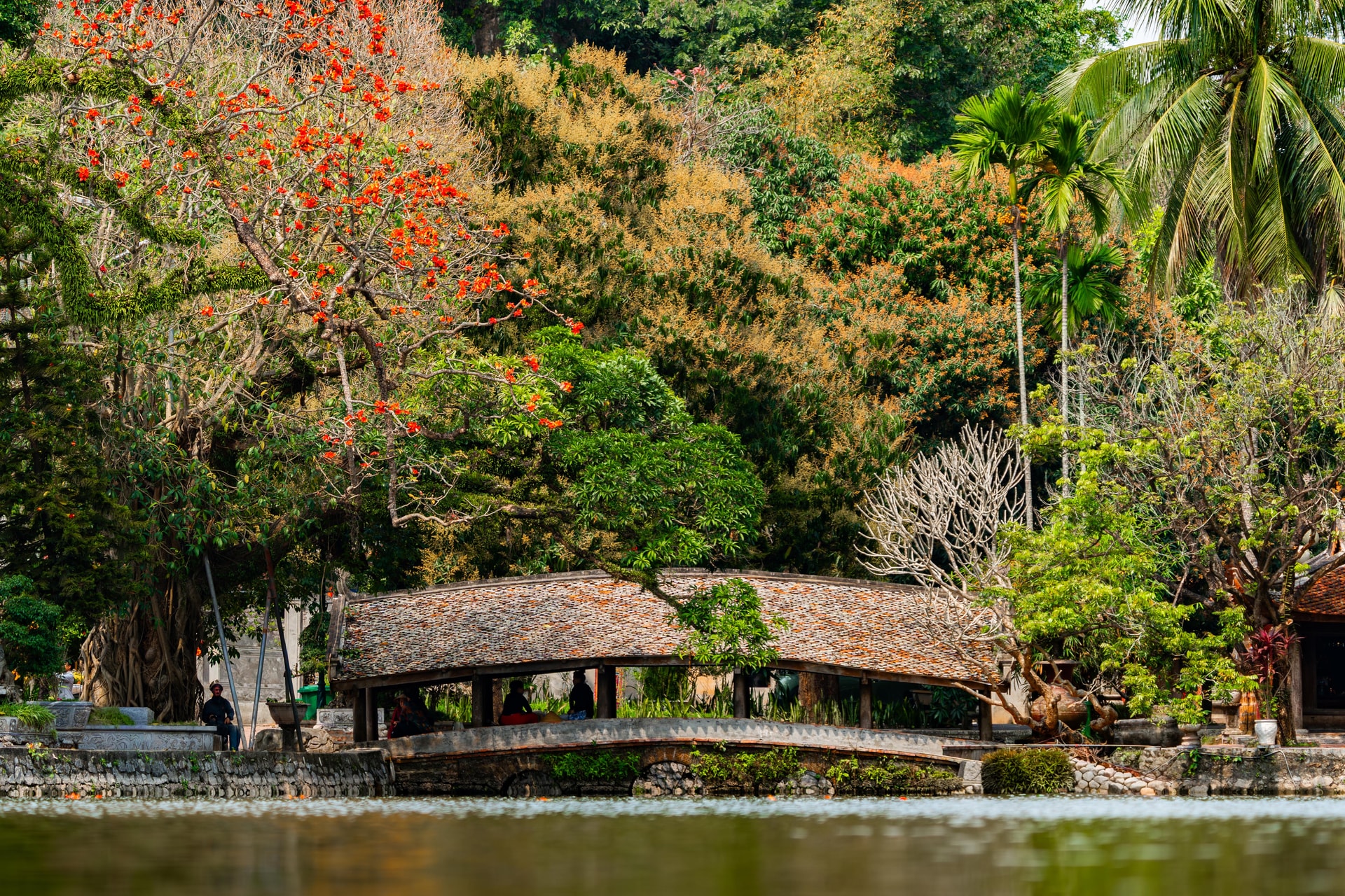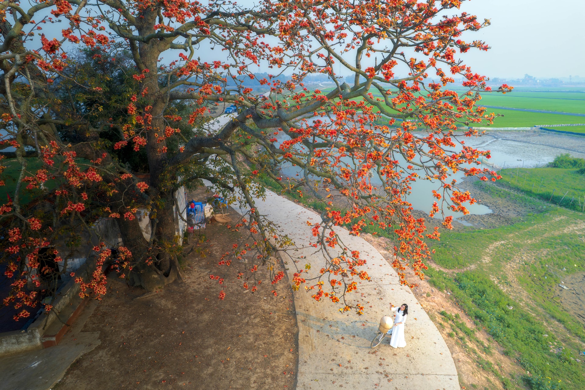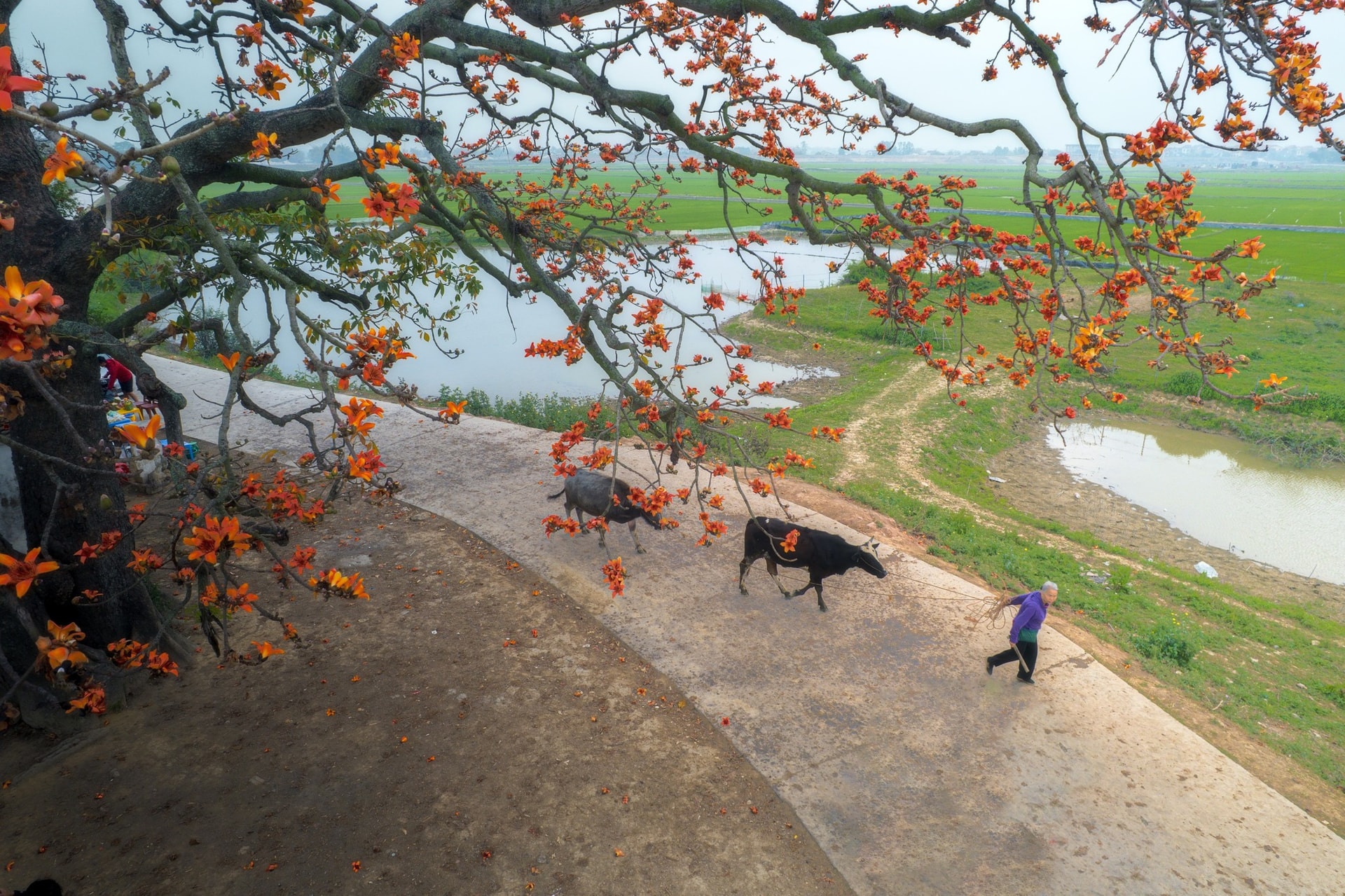 Khi hoa bắt đầu rụng, những cánh hoa đỏ rơi xuống phủ kín lối nhỏ, bờ ruộng và ven hồ, tạo nên một khung cảnh vừa rực rỡ vừa trầm lắng. Đó cũng là lúc mùa hoa dần khép lại.