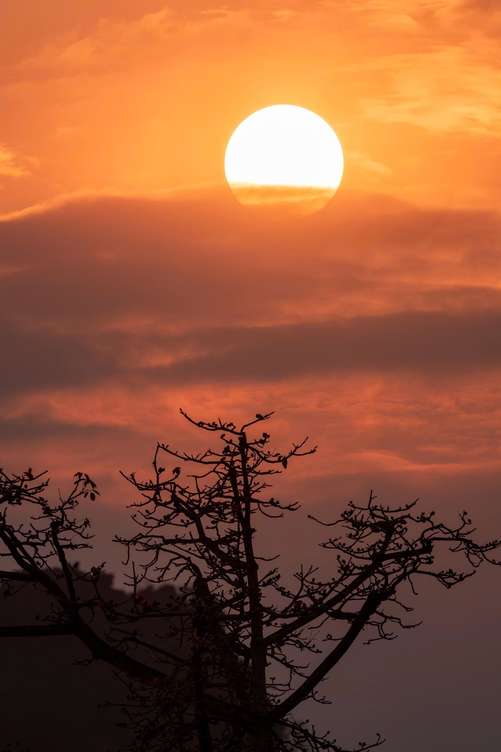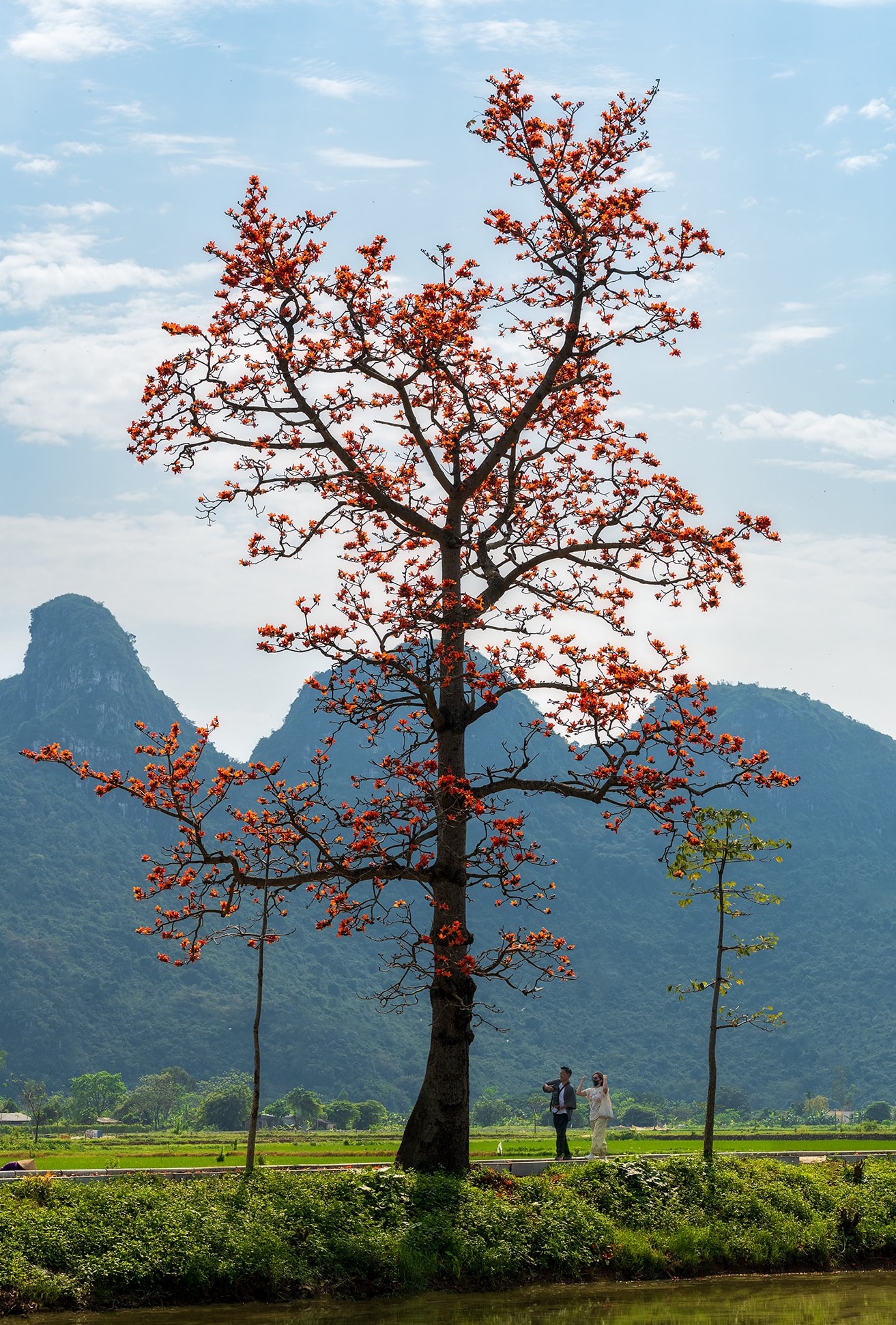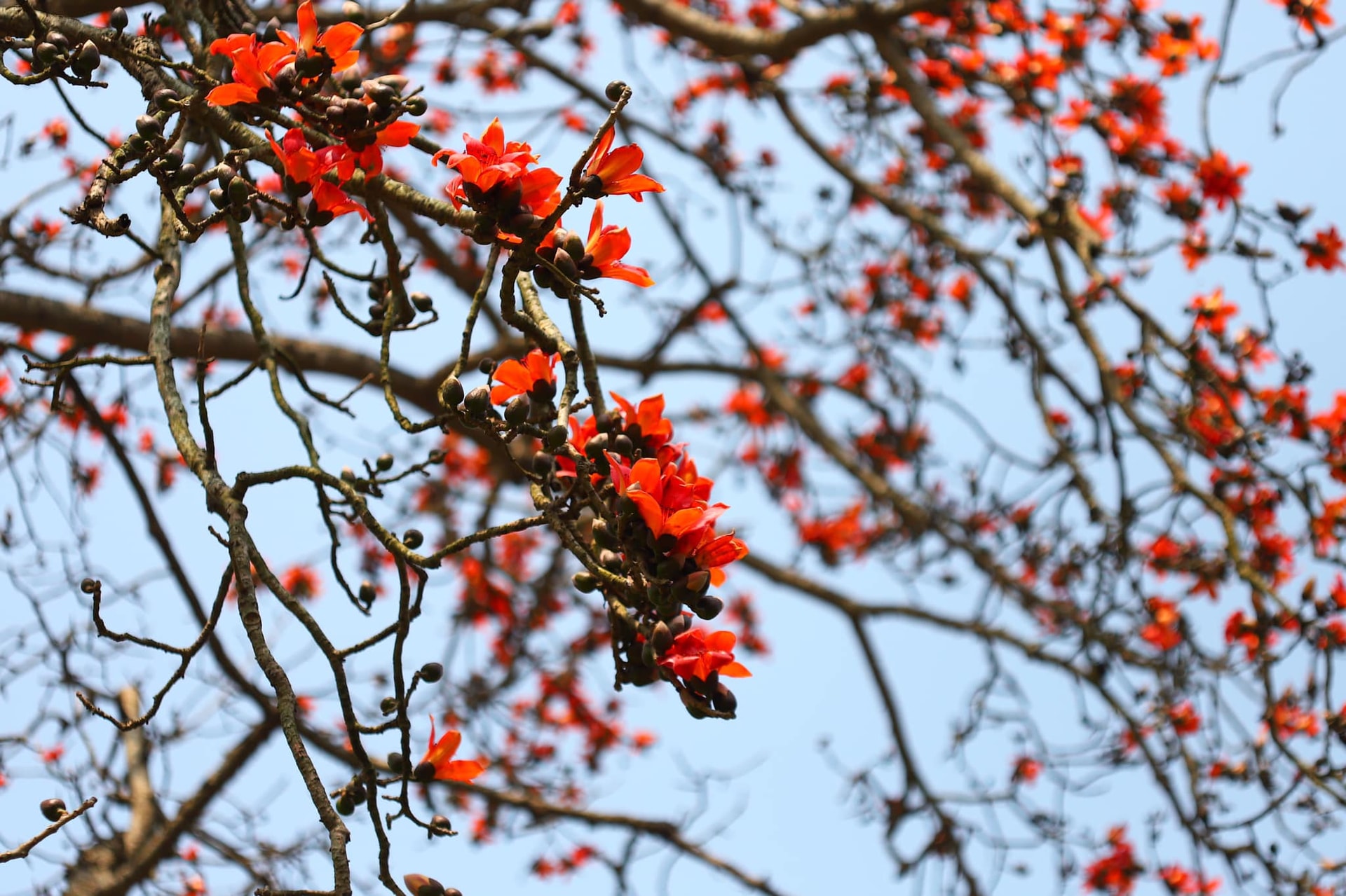 Sự tương phản giữa cành trơ và sắc hoa rực rỡ tạo nên nét đặc trưng của cây hoa gạo