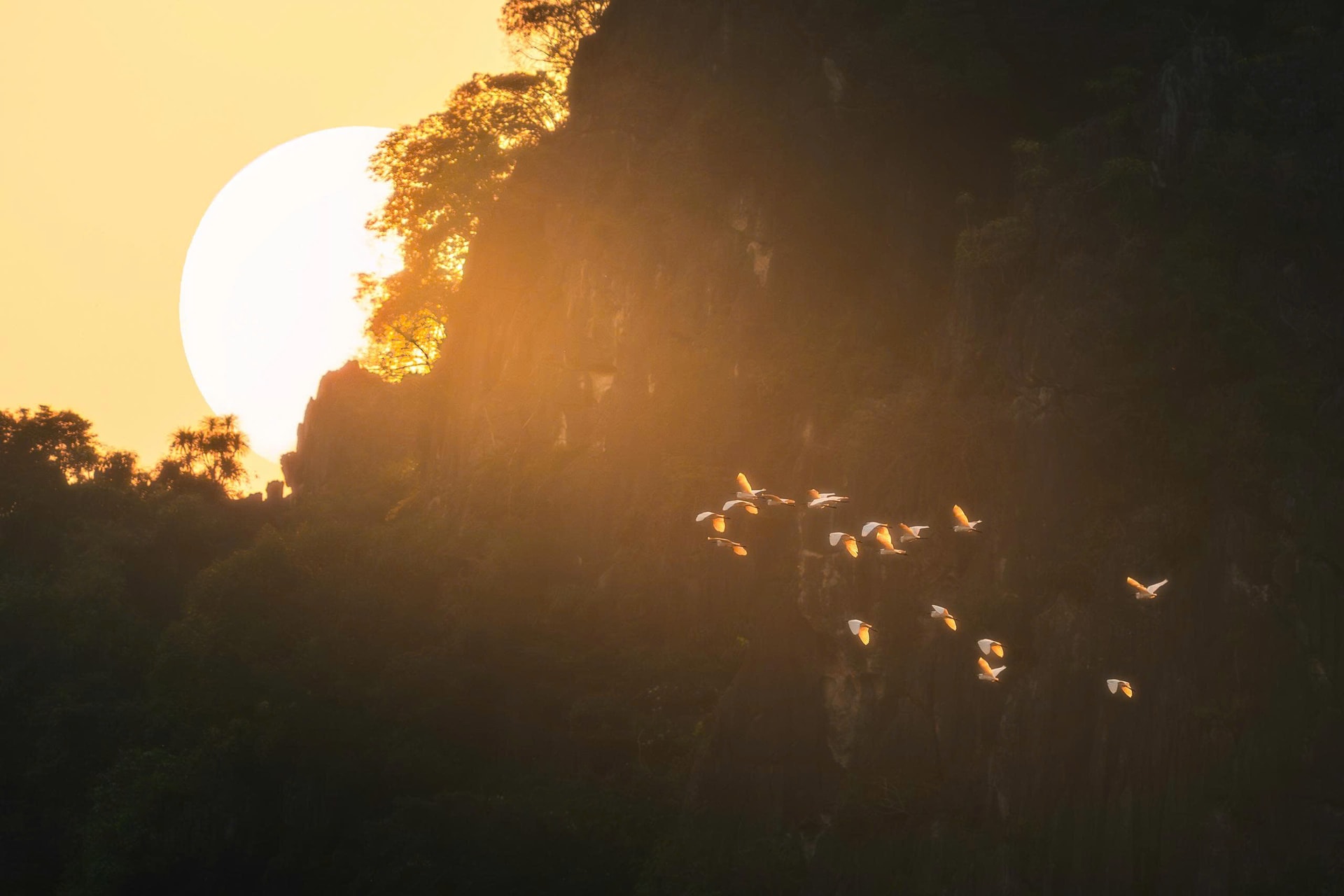 Đàn chim bay ngang vách núi đá vôi ở khu vực Quan Sơn (Mỹ Đức, Hà Nội)