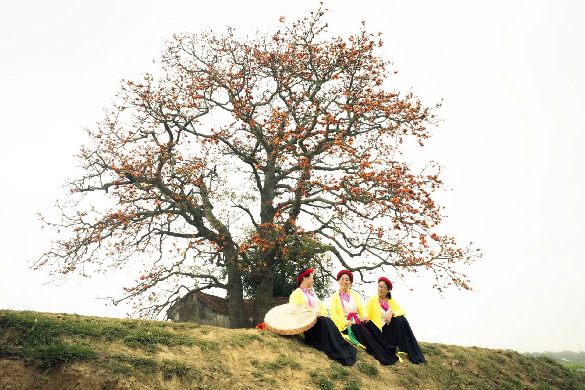 Những người phụ nữ Việt trong trang phục truyền thống của làng quê Bắc Bộ ngồi chơi ở bờ đê, dưới những tán cây gạo