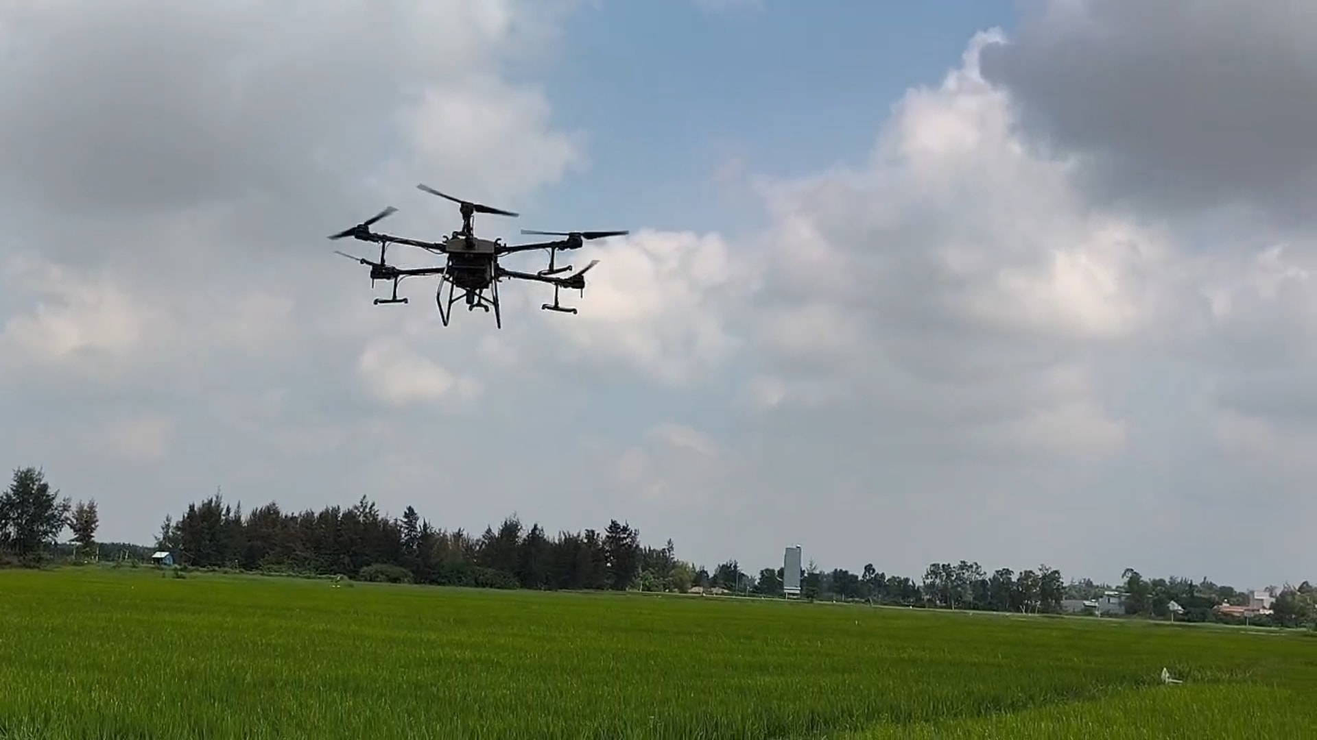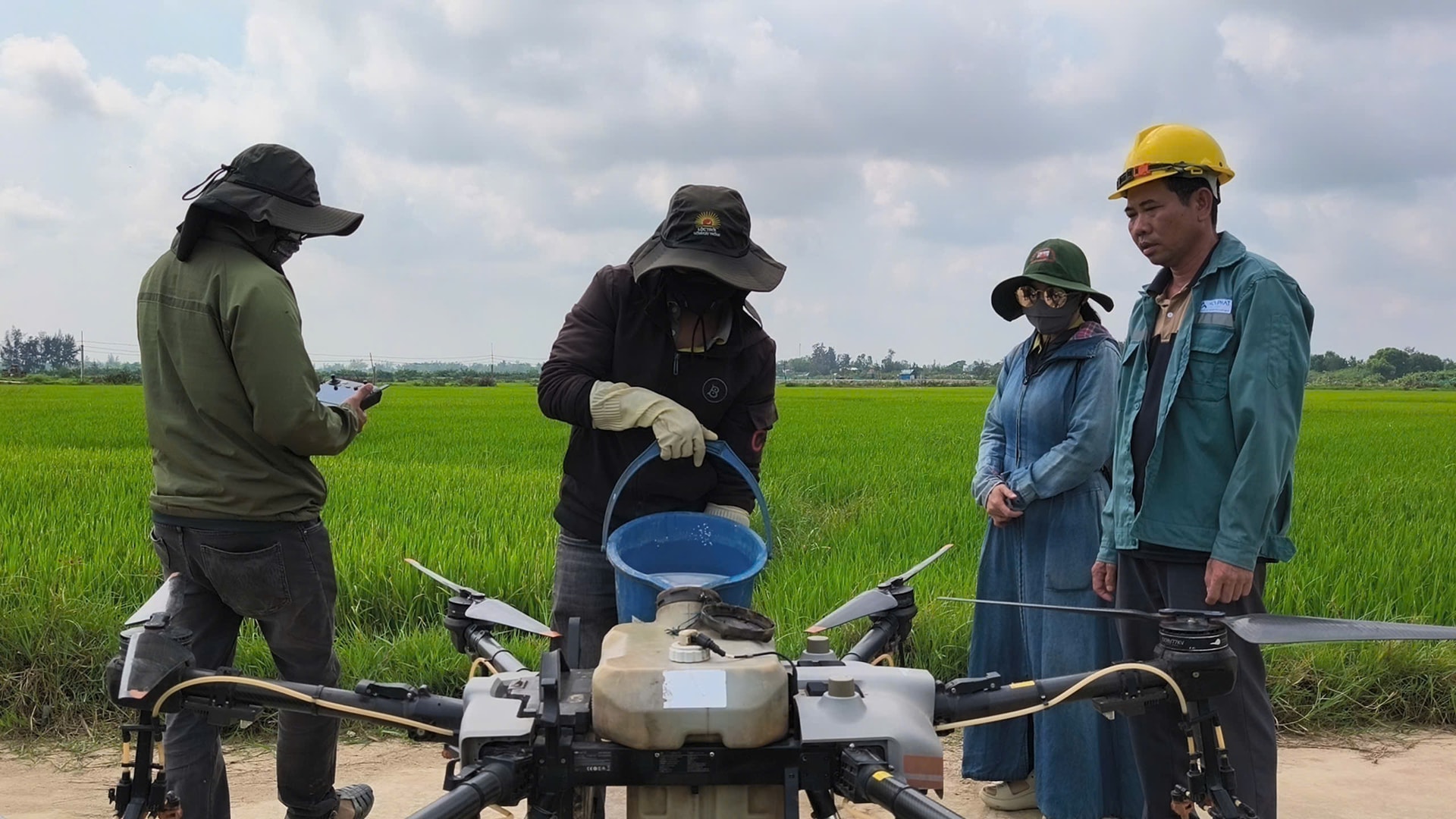 Sau khi được kỹ thuật viên kiểm tra đánh giá loại sâu bệnh và mức độ gây hại, một chiếc drone xuất hiện hỗ trợ nông dân phun thuốc trừ sâu cho cánh đồng liên kết sản xuất lúa giống thôn Nam Hà. Chỉ trong chưa đầy một giờ đồng hồ, từ khâu định vị bản đồ (Map), pha thuốc đến vận hành, chiếc drone đã hoàn thành việc phun thuốc cho diện tích lớn lúa của gia đình ông và các hộ xung quanh.
