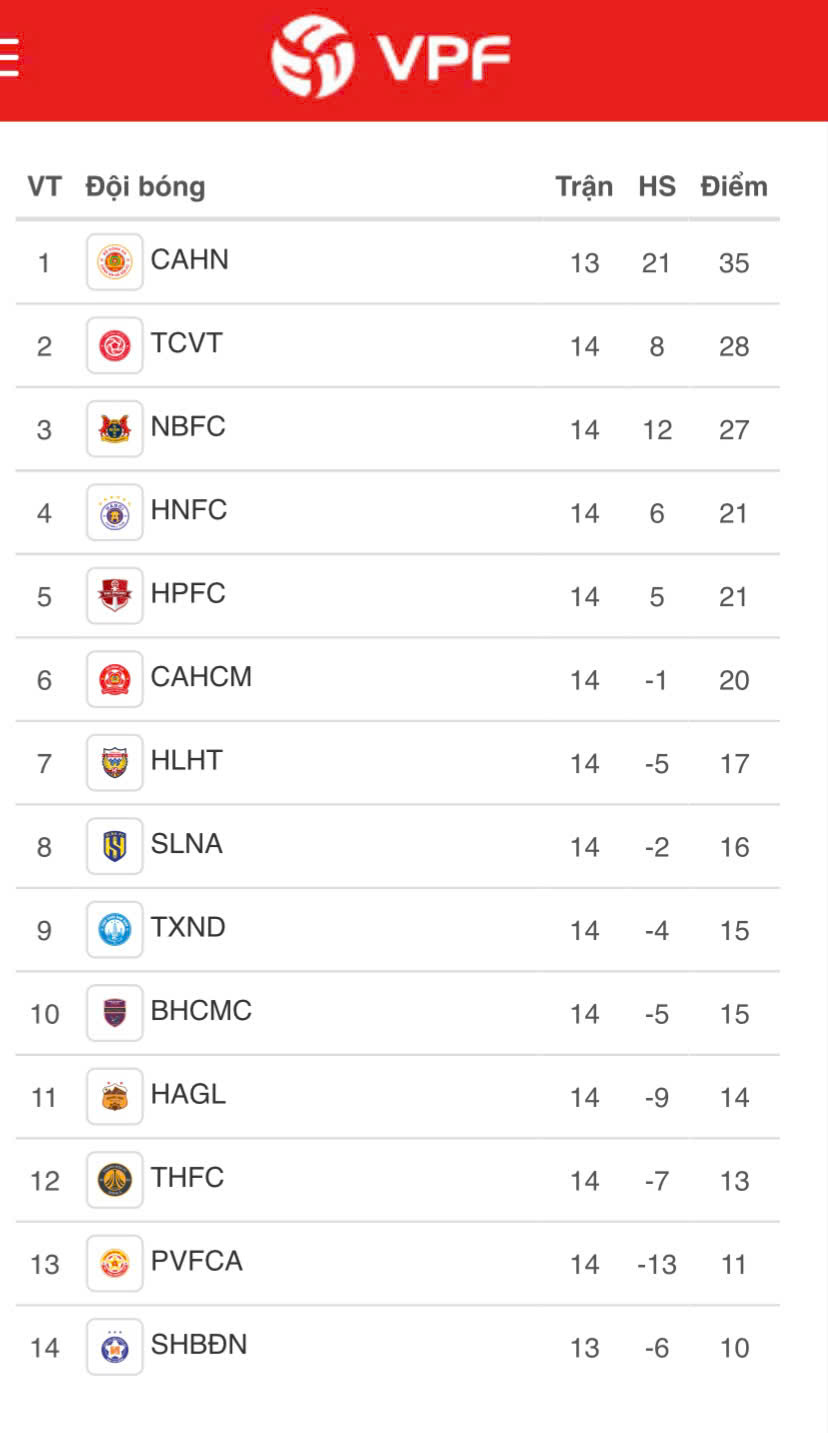 Kết thúc vòng 14 V-League 2025-2026, Công an Hà Nội FC giữ vững ngôi đầu bảng với 35 điểm, trong khi đó SHB Đà Nẵng dù có thắng lợi tưng bừng 3-0 trước PVF-CAND vẫn chưa thoát khỏi vị trí chót bảng (10 điểm).