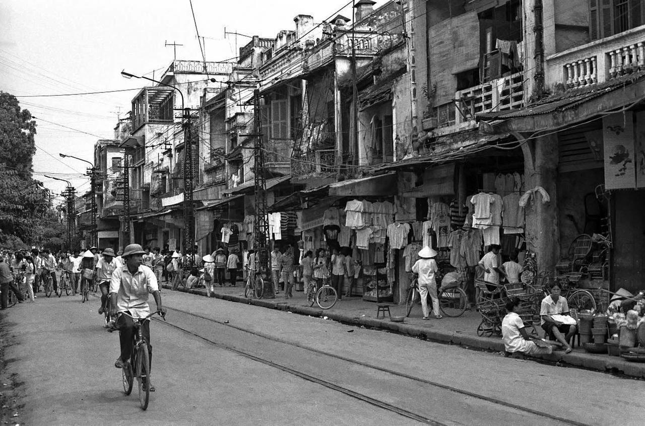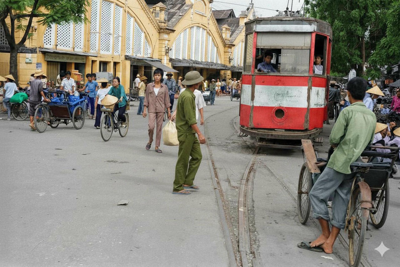 Tàu điện chạy qua chợ Đồng Xuân năm 1989. (Ảnh tư liệu)