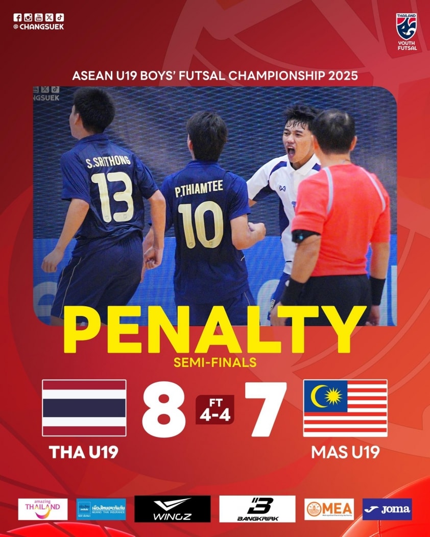 Trận bán kết giữa U19 futsal Thái Lan và U19 futsal Malaysia tại giải vô địch Đông Nam Á 2025 đã kết thúc với một kịch bản không tưởng. Sau 50 phút thi đấu nghẹt thở với tỷ số hòa 4-4, đội bóng xứ Chùa Vàng đã bản lĩnh hơn trên chấm luân lưu để giành chiến thắng 8-7, chính thức ghi tên mình vào trận chung kết gặp Indonesia.