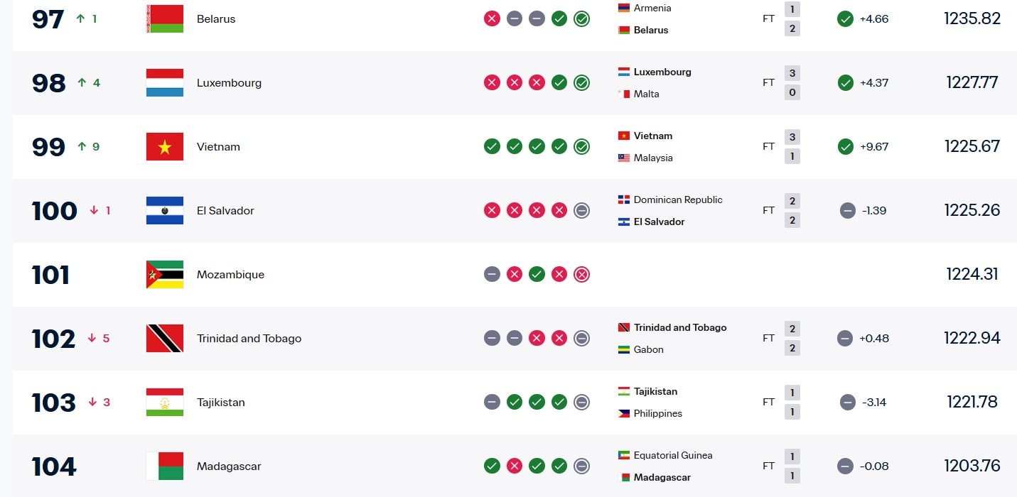 Sau khi được cộng lại điểm từ trận thắng Malaysia theo quyết định của AFC, đội tuyển tiếp tục tăng lên hạng 103 thế giới. Và chiến thắng 3-1 ở trận tái đấu – khi Malaysia không còn các cầu thủ nhập tịch trái phép – chính là lời khẳng định rõ ràng nhất về sức mạnh thực sự, giúp Việt Nam chính thức trở lại Top 100 ở vị trí 99 thế giới.