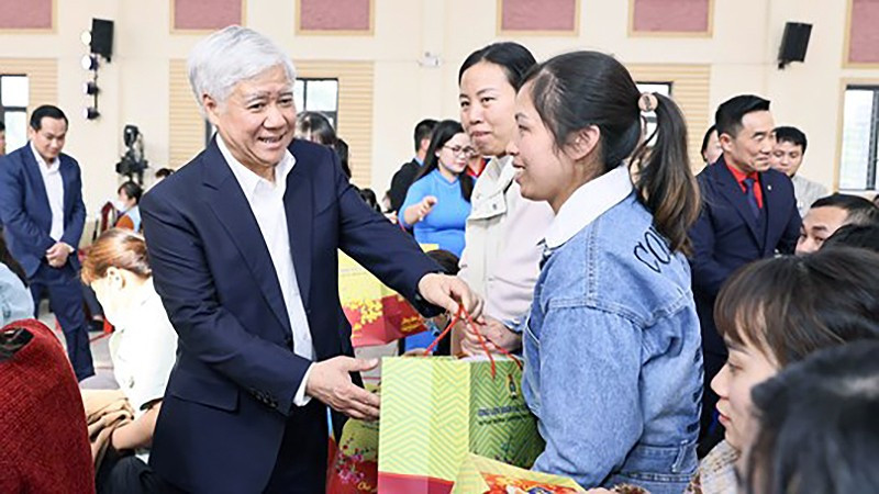 Đồng chí Đỗ Văn Chiến, Ủy viên Bộ Chính trị, Bí thư Trung ương Đảng, Chủ tịch Ủy ban Trung ương Mặt trận Tổ quốc Việt Nam trao quà tặng công nhân lao động có hoàn cảnh khó khăn tỉnh Hà Nam dịp Tết Nguyên đán Ất Tỵ năm 2025.