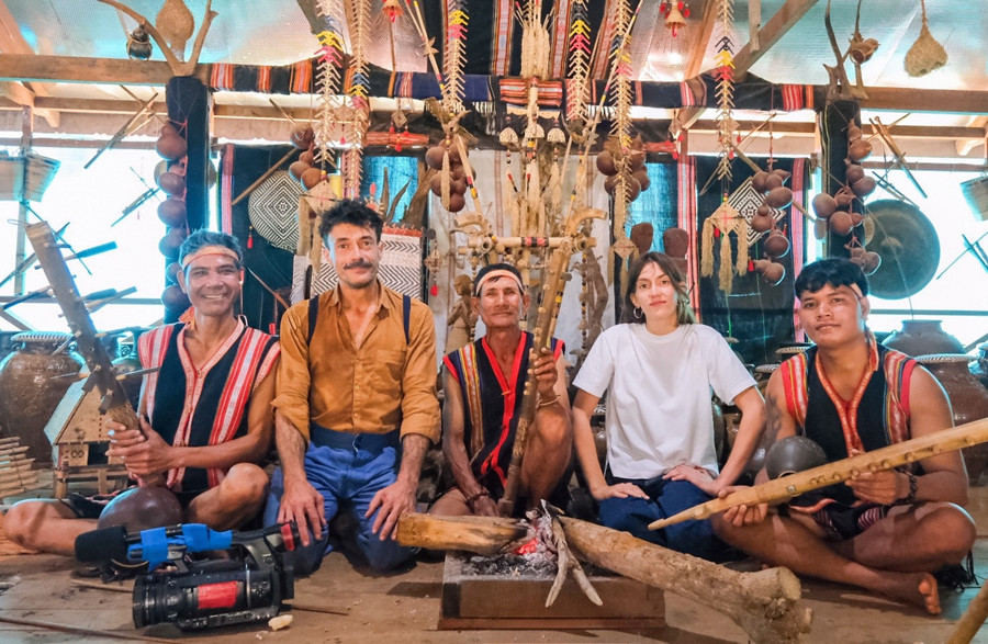 Đạo diễn, nghệ sĩ Vincent Moon cùng các nghệ nhân trong không gian văn hóa đặc trưng của người bản địa Tây Nguyên. Ảnh: Hoàng Ngọc