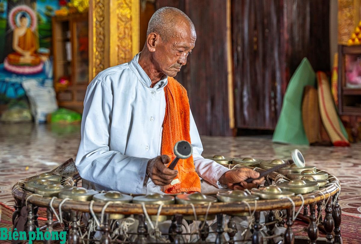 Một nghệ nhân người Khmer chơi nhạc cụ Kuông Thum (đàn đồng lớn). Ảnh: Thủy Lê