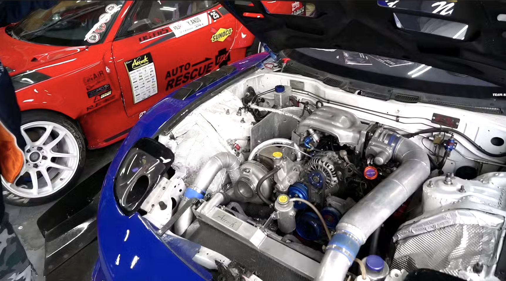 Trong gara của Ando-san là những chiếc RX-7 từng góp mặt tại các giải đấu danh tiếng như World Time Attack Challenge hay Formula Drift Japan. Mỗi chiếc đều mang trong mình tinh thần thủ công và kỹ thuật đỉnh cao của Nhật: bộ bodykit RE Amemiya GT Aero bằng sợi carbon, nắp capo carbon khô, mui tùy chỉnh, cùng các khối động cơ hai hoặc ba rotor đầy uy lực.