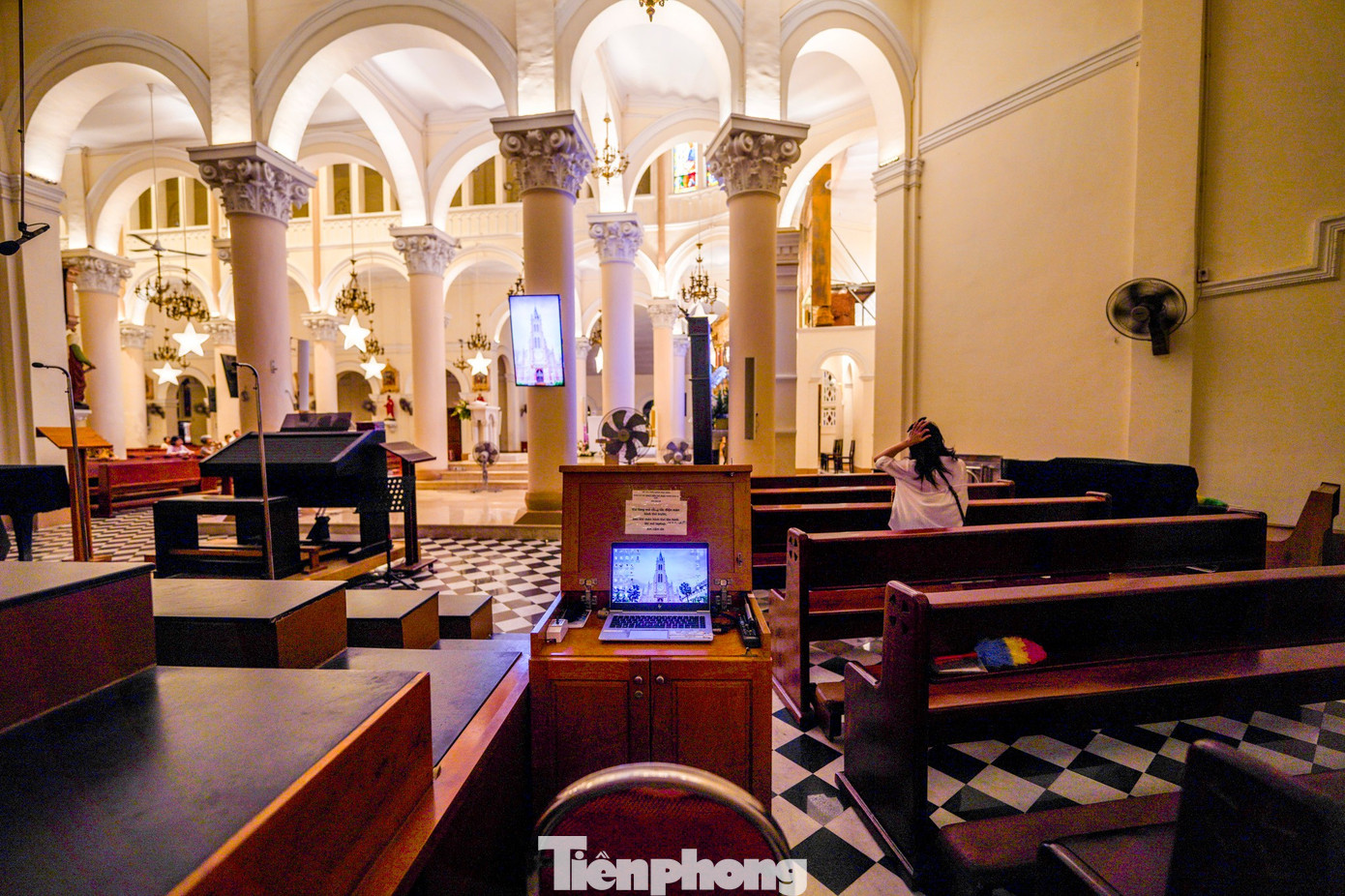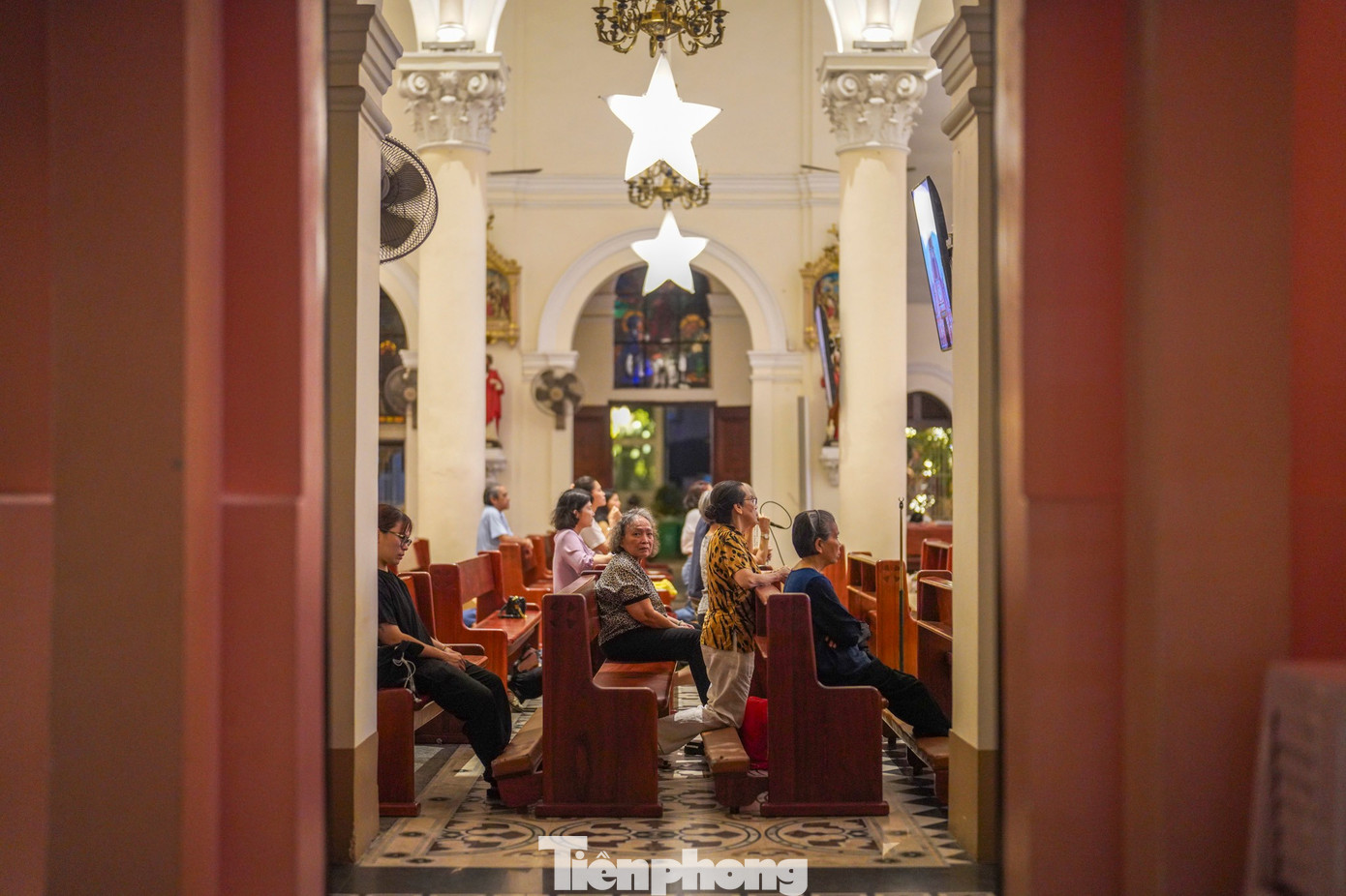 Phía trong thánh đường, sắc hồng chủ đạo tạo nên sự đồng nhất từ vách tường đến các hàng cột. Để hỗ trợ giáo dân, nhà thờ lắp đặt hai màn hình lớn trình chiếu trực tiếp các nghi lễ, mọi vị trí đều có thể theo dõi thuận tiện.
