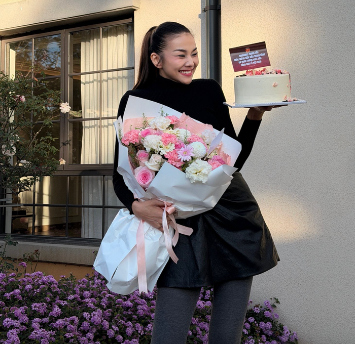 Dòng trạng thái ngắn gọn nhưng đầy cảm xúc nhanh chóng thu hút sự quan tâm lớn từ công chúng. Trong loạt hình ảnh được đăng tải, Thanh Hằng ăn diện chỉn chu, nở nụ cười rạng rỡ khi nhận bánh kem và một bó hoa lớn.