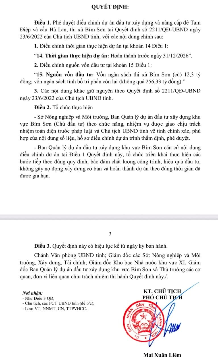 Cụ thể, Phó Chủ tịch UBND tỉnh Thanh Hóa Mai Xuân Liêm vừa ký quyết định phê duyệt điều chỉnh dự án đầu tư xây dựng, nâng cấp đê Tam Điệp và cầu Hà Lan hoàn thành trước 31/12/2026.
