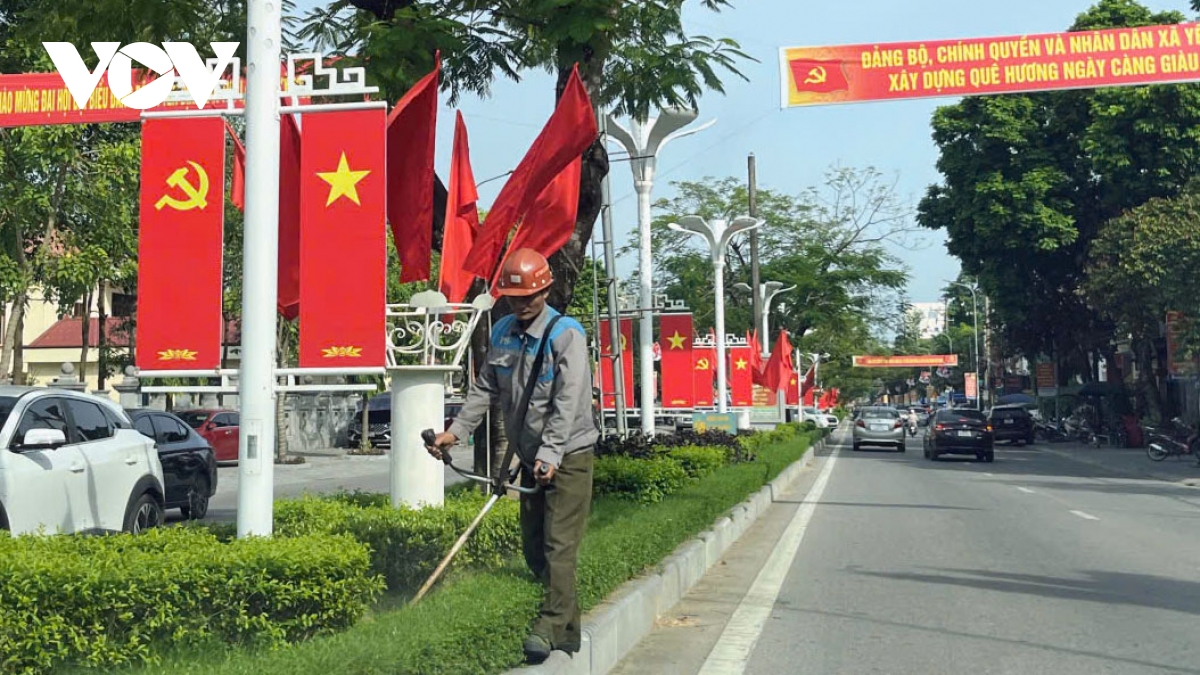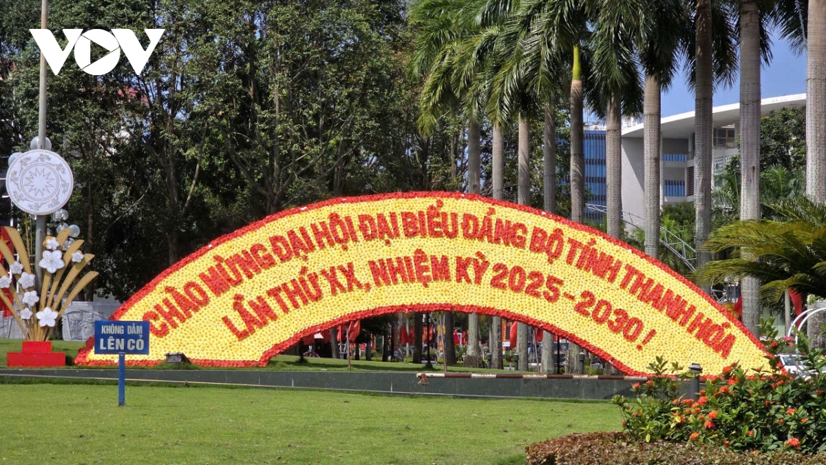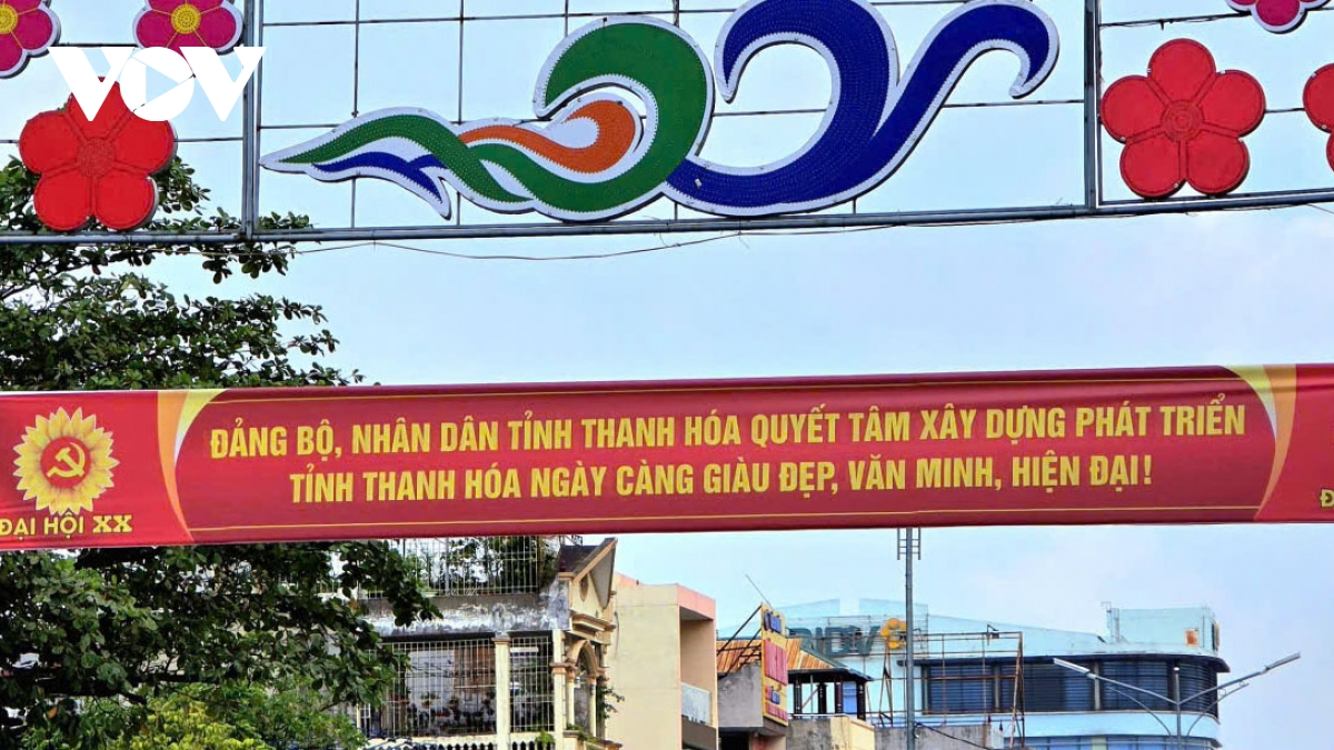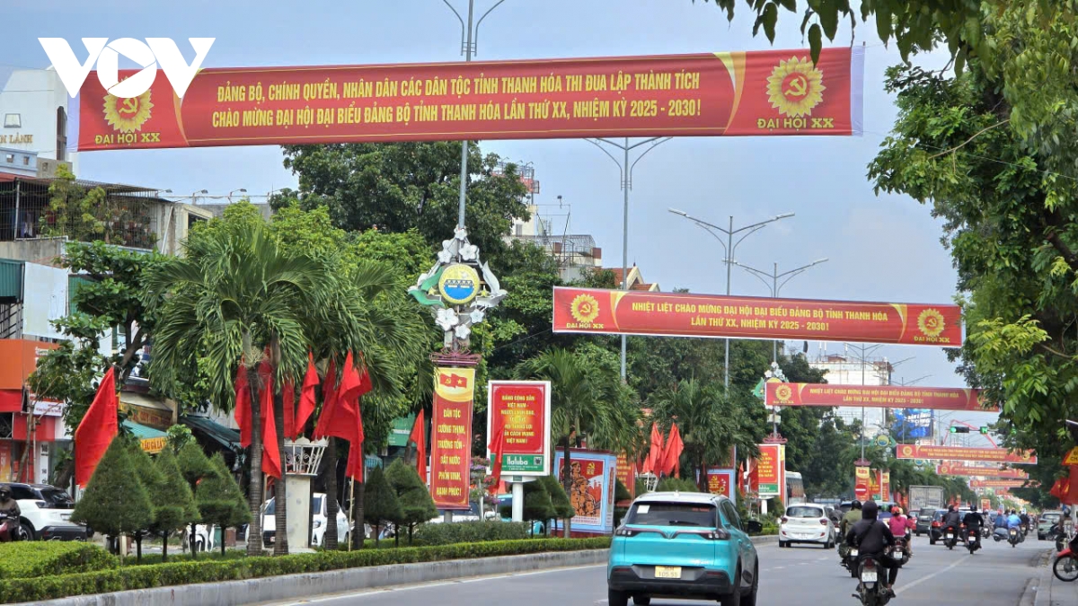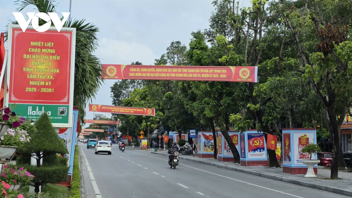 Trên nhiều tuyến đường của tỉnh Thanh Hóa, nhất là những khu trung tâm rực rỡ sắc cờ, pano, áp phích, tạo nên không khí phấn khởi chào mừng Đại hội Đảng bộ tỉnh Thanh Hóa lần thứ XX, nhiệm kỳ 2025 - 2030.