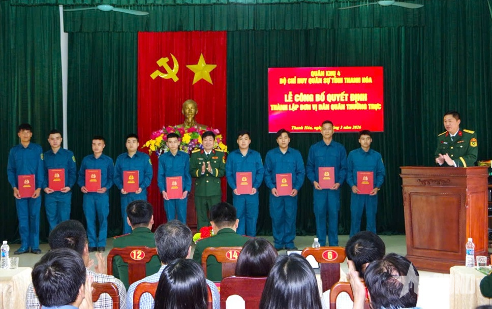 Đại tá Phạm Văn Sâm, Phó bí thư Thường trực Đảng ủy, Chính ủy Bộ CHQS tỉnh Thanh Hóa trao Quyết định cho các chiến sĩ DQTT tại Ban chỉ huy phòng thủ Khu vực 1 - Triệu Sơn.