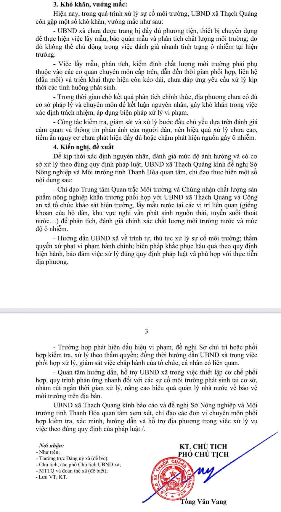 Hiện UBND xã đang tiếp tục phối hợp với các cơ quan chuyên môn để kiểm tra, đối chiếu, làm rõ mối liên hệ giữa nguồn nước nêu trên với hoạt động xả thải, đồng thời xác định chính xác nguyên nhân gây ra hiện tượng ô nhiễm theo quy định.