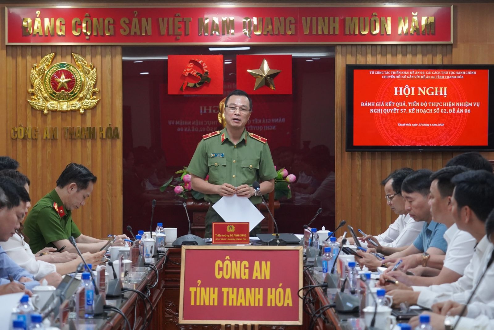 Phát biểu kết luận hội nghị, Giám đốc Công an tỉnh, Tổ trưởng Tổ công tác triển khai Đề án số 06 tỉnh Thanh Hóa, Thiếu tướng Tô Anh Dũng, ghi nhận các đơn vị đã có chuyển biến tích cực trong triển khai Nghị quyết 57 và Đề án 06. Nổi bật là đẩy mạnh làm sạch dữ liệu đất đai, cải cách thủ tục hành chính và triển khai một số giải pháp số bước đầu phát huy hiệu quả.