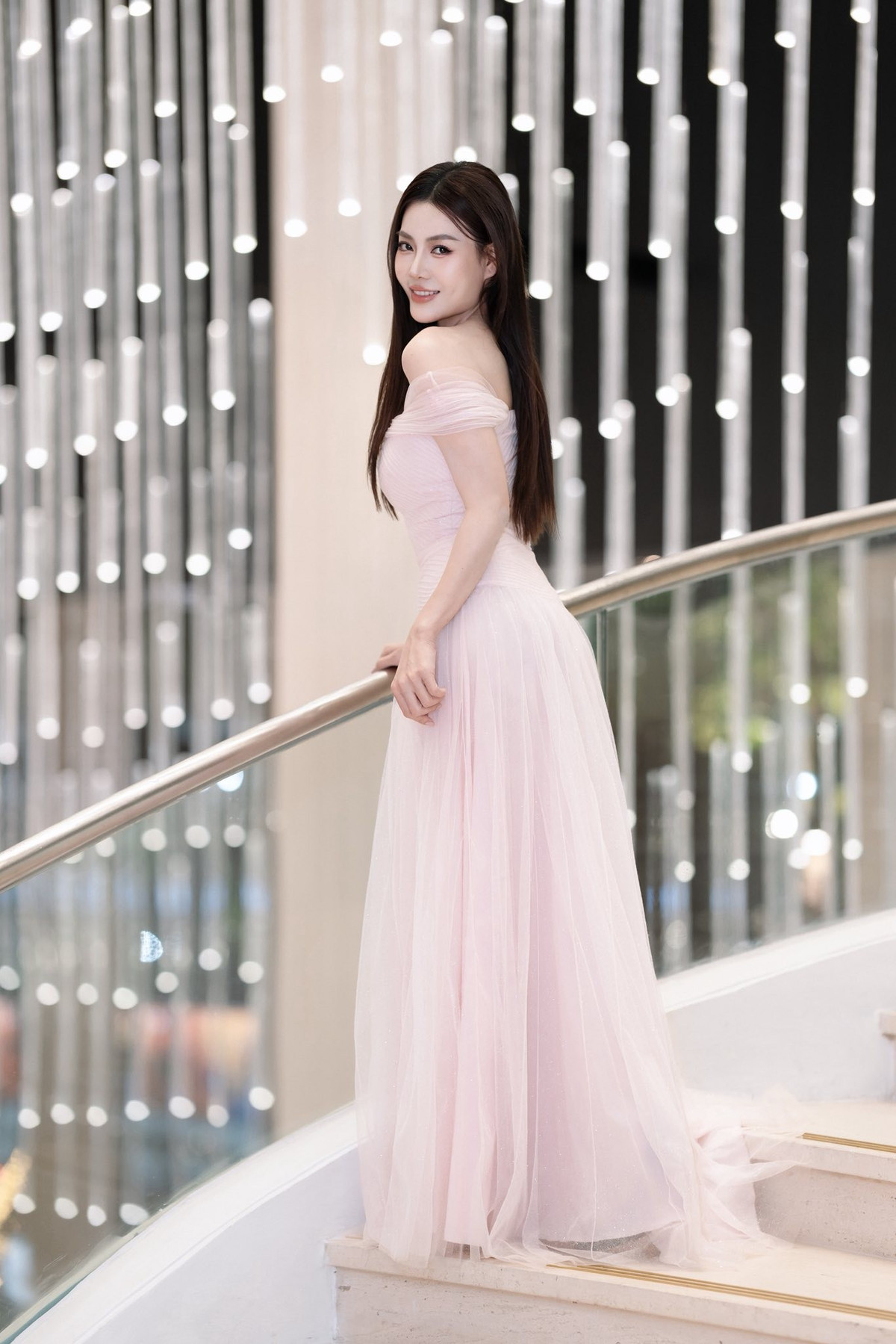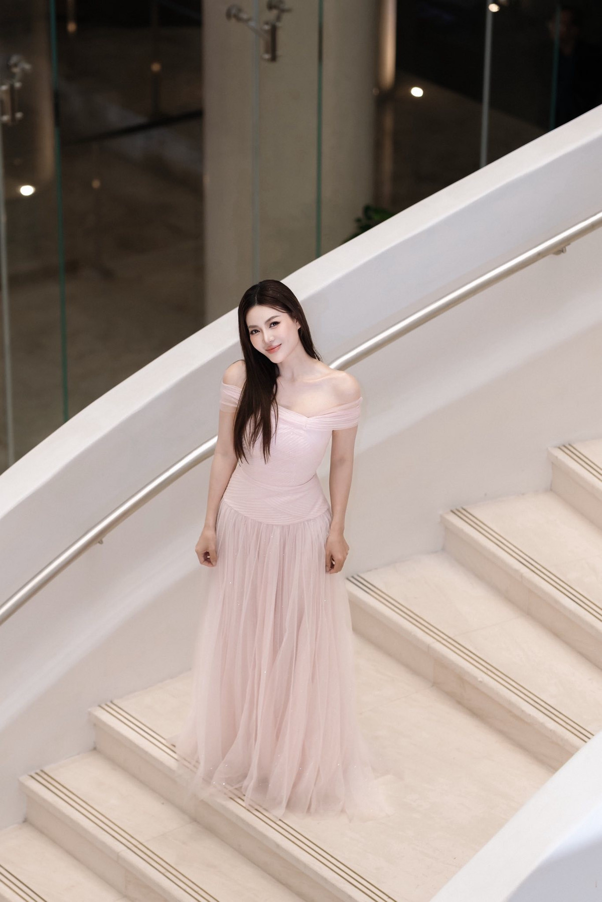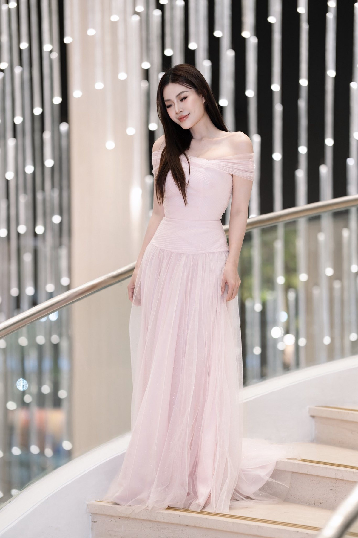 Gam màu hồng phấn nhẹ nhàng cùng chất liệu mềm mại giúp tổng thể trang phục thêm phần thanh thoát, tôn trọn vẻ đẹp trong trẻo của nữ diễn viên.