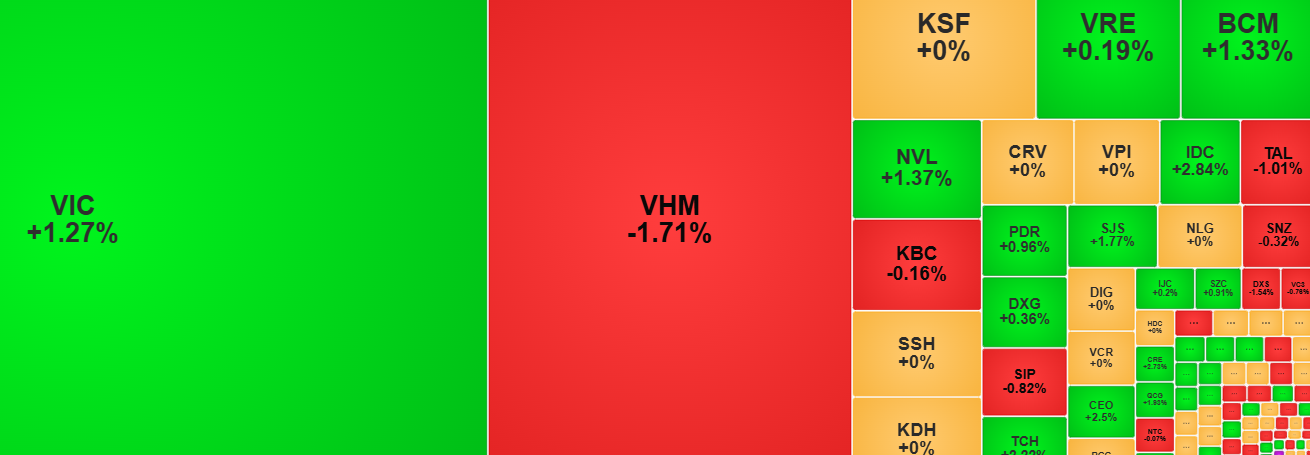 Tại nhóm cổ phiếu họ Vingroup, VHM giảm 1,71%, lấy đi nhiều điểm nhất (1,72 điểm), VPL lấy 0,27 điểm trong khi VIC đóng góp nhiều nhất vào thị trường với 3 điểm.