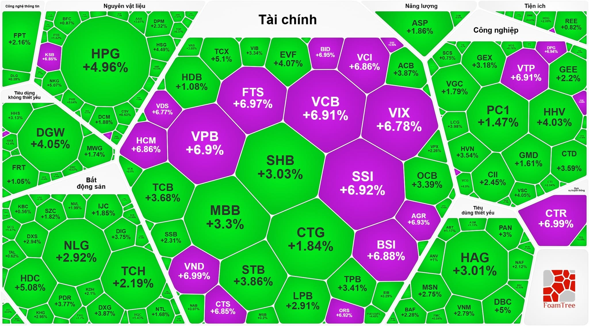 Nhóm cổ phiếu tài chính (ngân hàng, chứng khoán) bứt phá, hàng loạt cổ phiếu tăng kịch trần: VPB, VCB, BID; SSI, VIX, HCM, SHS, VND, FTS, BSI, CTS, VDS, AGR, ORS…
