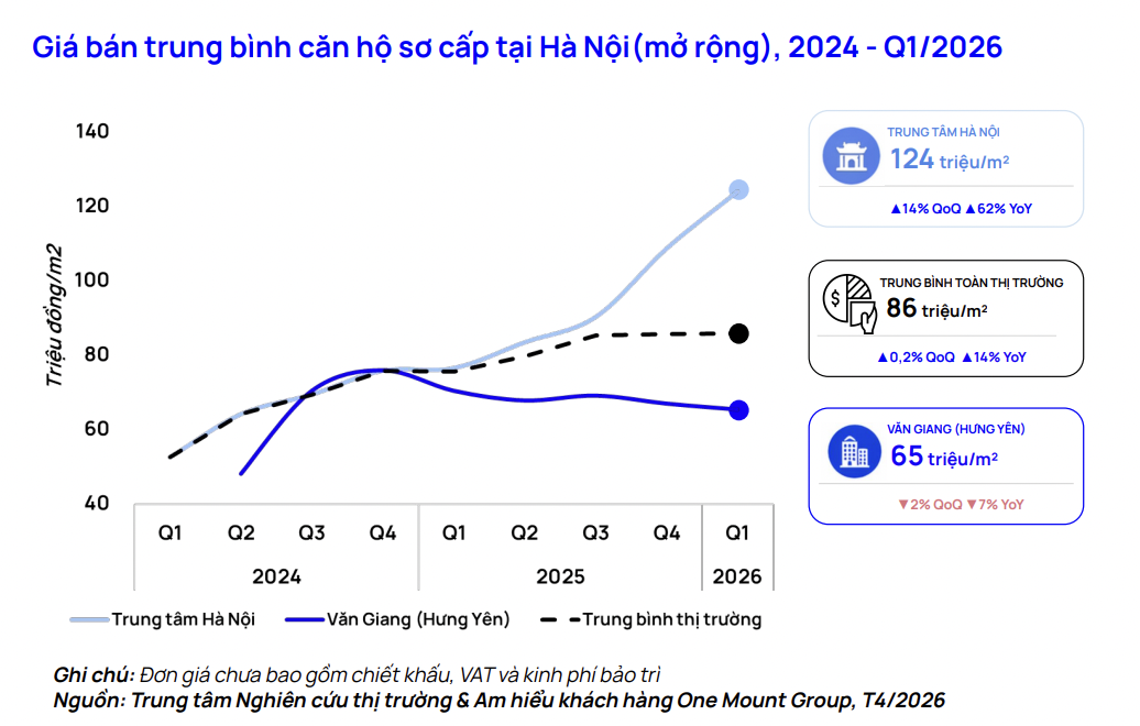 Theo One Mount Group, bên cạnh yếu tố trùng vào dịp Tết thì biến động lãi suất và bất ổn tại Trung Đông cũng khiến người mua có xu hướng thận trọng và kéo dài thời gian đưa ra quyết định. Trong quý I, toàn thị trường Hà Nội ghi nhận khoảng 19.500 giao dịch, giảm 48% theo quý. Mức giảm xuất hiện ở hầu hết loại hình, phản ánh yếu tố mùa vụ đầu năm và tâm lý người mua thận trọng hơn trong bối cảnh lãi suất tăng và áp lực từ xung đột toàn cầu.
