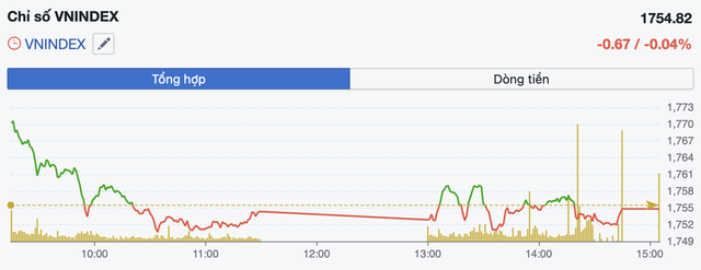 Kết thúc phiên sáng, VN-Index giảm 1,16 điểm (-0,07%) xuống 1.754,33 điểm. Thanh khoản đạt 276,3 triệu cổ phiếu, tương ứng giá trị 8.484 tỷ đồng.