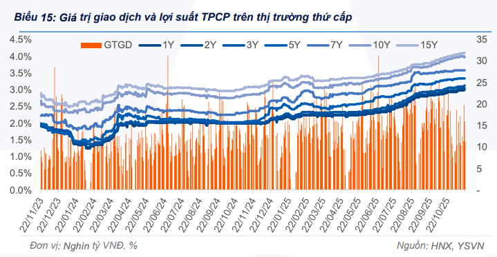 Tính đến ngày 21/11/2025, Kho bạc Nhà nước đã huy động được khoảng 305.500 tỷ đồng, tương đương 61,1% kế hoạch năm. Các chuyên gia từ Chứng khoán Yuanta Việt Nam cho rằng, mặc dù lợi suất trái phiếu trên cả thị trường sơ cấp và thứ cấp trong tuần tăng nhẹ hoặc gần như đi ngang, thanh khoản vẫn tiếp tục được cải thiện trong hai tuần liên tiếp. Điều này cho thấy nhu cầu nắm giữ trái phiếu, đặc biệt ở kỳ hạn trung và dài hạn đang duy trì ổn định khi hệ thống ngân hàng dần cân bằng trở lại và các tổ chức đầu tư có xu hướng gia tăng phân bổ vào kênh tài sản an toàn trước thời điểm chốt sổ cuối năm.