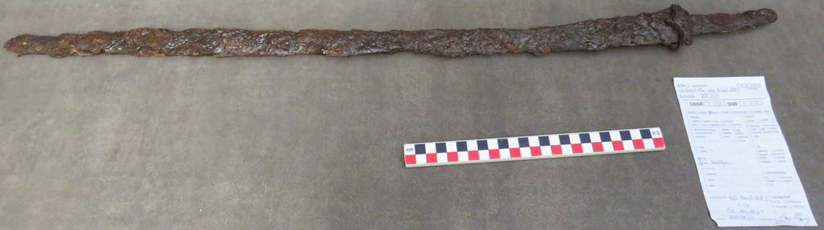 Thanh kiếm quý hiếm với lưỡi và chuôi còn nguyên vẹn. Lưỡi kiếm dài với đường cong thanh thoát và có những dấu vết trang trí trên lưỡi kiếm. Ảnh: @Bảo tàng Szent István Király.