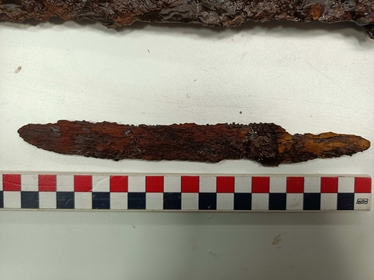 Trong mộ vị chiến binh này còn nguyên vẹn một thanh kiếm, đầu mũi tên có lẽ đã từng nằm trong bao đựng tên, con dao dài có lẽ cũng được dùng làm vũ khí, cùng phụ kiện thắt lưng bạc, dây bện mạ vàng. Ảnh: @Bảo tàng Szent István Király.