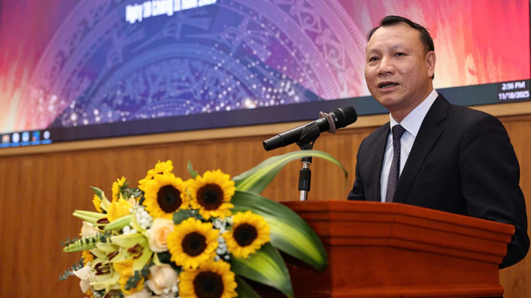 Hiệu trưởng Trường đại học Sư phạm Hà Nội, Phó Giáo sư, Tiến sĩ Nguyễn Đức Sơn phát biểu tại Lễ công bố. (Ảnh: THANH TÙNG)
