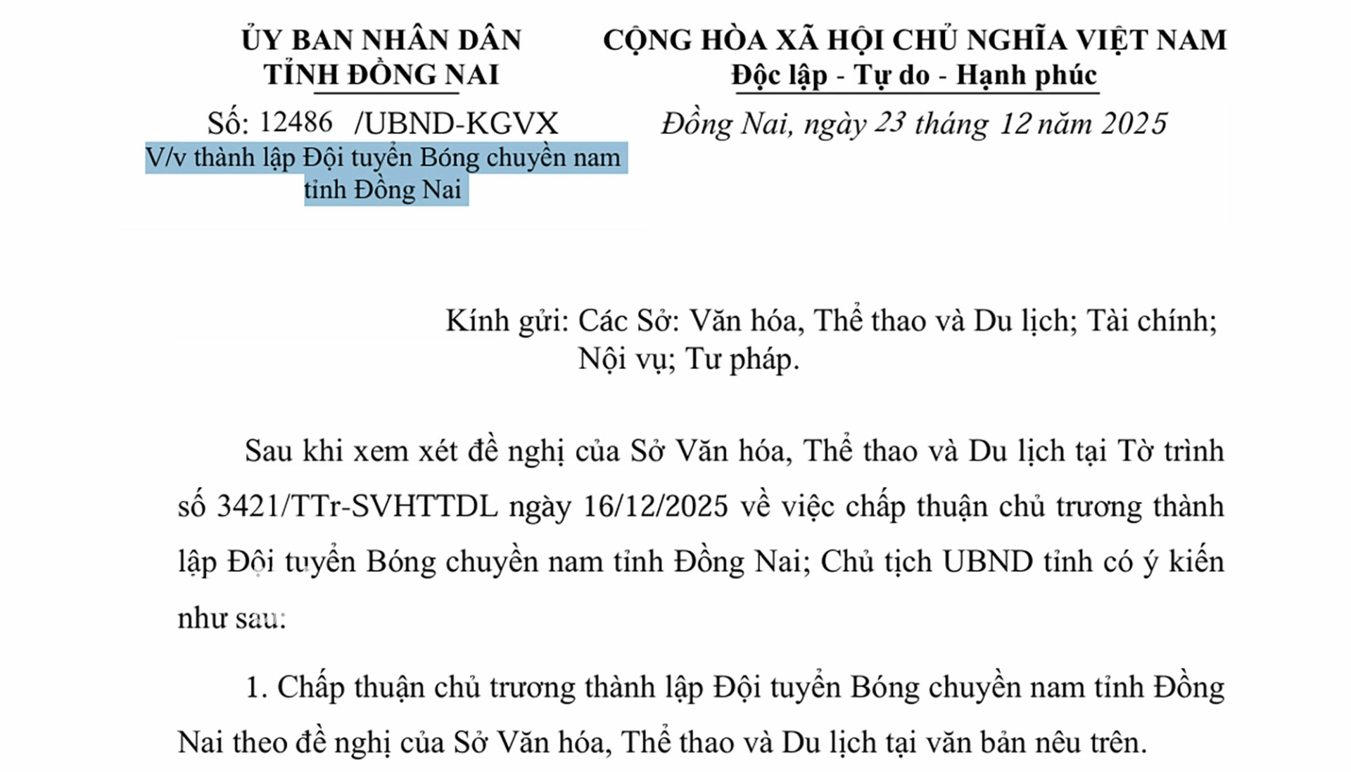 Theo đó, sau khi xem xét đề nghị của Sở Văn hóa, Thể thao và Du lịch tại Tờ trình số 3421/TTr-SVHTTDL ngày 16-12-2025 về việc chấp thuận chủ trương thành lập Đội tuyển Bóng chuyền nam tỉnh Đồng Nai, Chủ tịch UBND tỉnh chấp thuận chủ trương thành lập Đội tuyển Bóng chuyền nam tỉnh Đồng Nai theo đề nghị của Sở Văn hóa, Thể thao và Du lịch. Đồng thời, giao Sở Văn hóa, Thể thao và Du lịch chủ trì, phối hợp Sở Nội vụ, Sở Tư pháp, Sở Tài chính, các cơ quan, đơn vị liên quan rà soát trình tự thủ tục theo quy định của pháp luật về thẩm quyền thành lập, tổ chức, hoạt động, kinh phí của Đội tuyển bóng chuyền; báo cáo đề xuất cấp có thẩm quyền theo quy định...