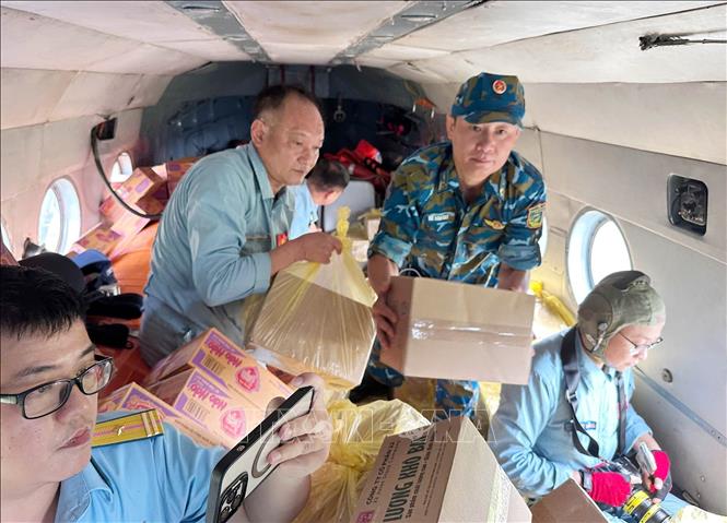 Phi công chuyển hàng hóa từ trực thăng xuống các địa điểm thuộc xã Vân Nham và xã Yên Bình (Lạng Sơn) đang bị cô lập vì lũ. Ảnh: TTXVN phát