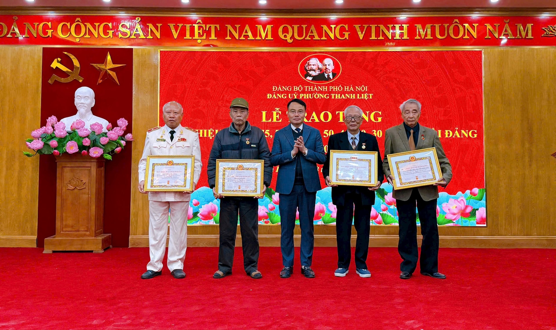 Đợt này, Đảng bộ phường Thanh Liệt có 74 đảng viên được nhận Huy hiệu Đảng, trong đó 1 đồng chí vinh dự được trao tặng Huy hiệu 75 năm tuổi Đảng; 1 đồng chí vinh dự trao tặng Huy hiệu 70 năm tuổi Đảng; 6 đồng chí tặng Huy hiệu 60 năm tuổi Đảng; 7 đồng chí trao tặng Huy hiệu 55 năm tuổi Đảng; 4 đồng chí vinh dự trao tặng Huy hiệu 50 năm tuổi Đảng; 21 đồng chí vinh dự trao tặng Huy hiệu 45 năm tuổi Đảng; 20 đồng chí vinh dự trao tặng Huy hiệu 40 năm tuổi Đảng và 14 đồng chí vinh dự trao tặng Huy hiệu 30 năm tuổi Đảng.