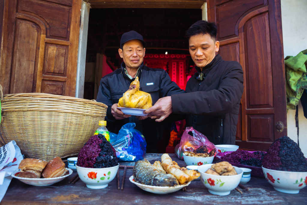 Từ sáng sớm, các gia đình tất bật chuẩn bị lễ vật gồm: xôi ngũ sắc, bánh khảo, lợn quay, rượu… để dâng lên tổ tiên.