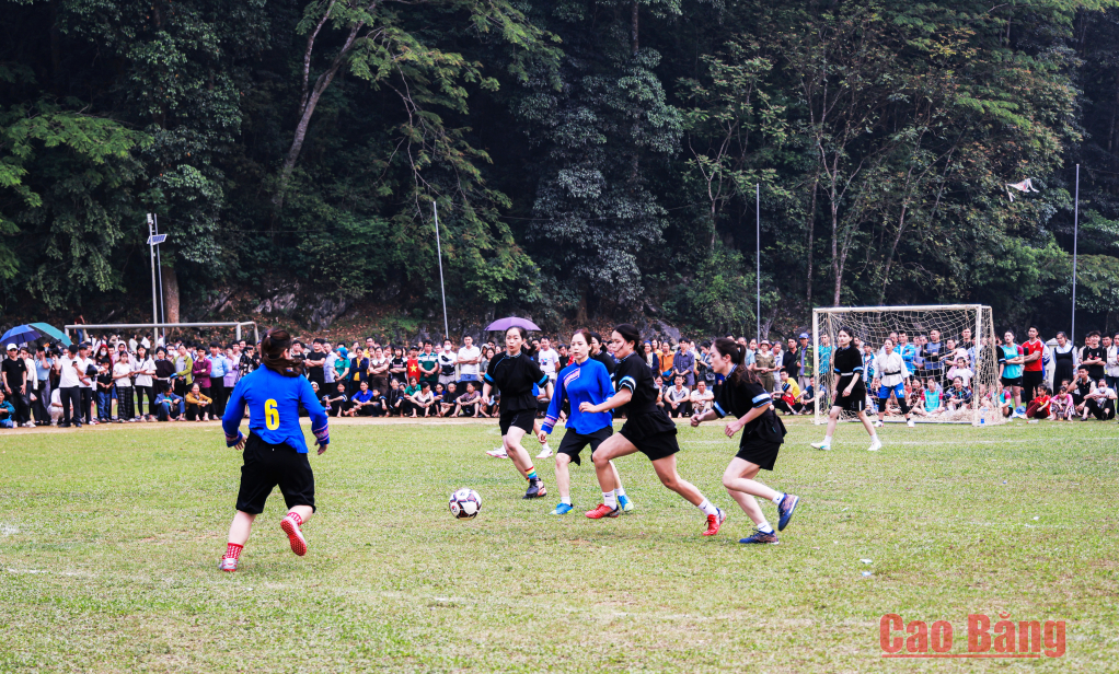 Các cô gái trong trang phục dân tộc Nùng thi đấu giao lưu bóng đá trong lễ hội tạo nét độc đáo và không khí sôi động, thu hút đông đảo nhân dân và du khách tham gia cổ vũ.