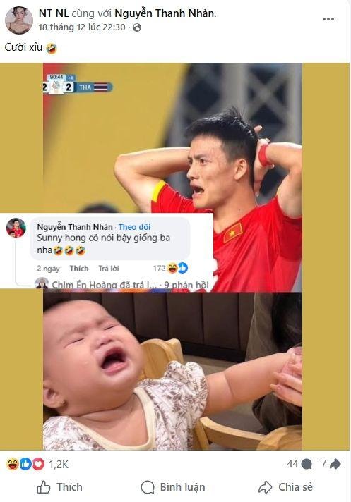 Đáng chú ý, Thanh Nhàn đã trực tiếp vào bình luận dí dỏm: "Sunny không có nói bậy giống ba nha". Lời thừa nhận khéo léo về việc mình đã có chút "vạ miệng" trong lúc cảm xúc dâng trào trên sân cỏ khiến khán giả vô cùng thích thú. Sự gần gũi và tính cách vui vẻ của tiền đạo thuộc biên chế PVF-CAND đã ghi điểm lớn trong mắt công chúng.