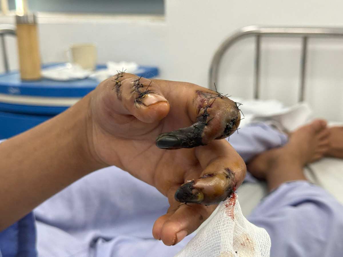 Bệnh nhân được đưa ngay tới cơ sở y tế gần đó. Kết quả thăm khám ban đầu cho thấy không gãy xương, nhưng diện lóc da rộng. Các bác sĩ đã khâu bảo tồn cả ba ngón. Tuy nhiên, sau đó, ngón trỏ và ngón giữa xuất hiện tình trạng đổi màu, tím đen – dấu hiệu hoại tử do mất cấp máu.