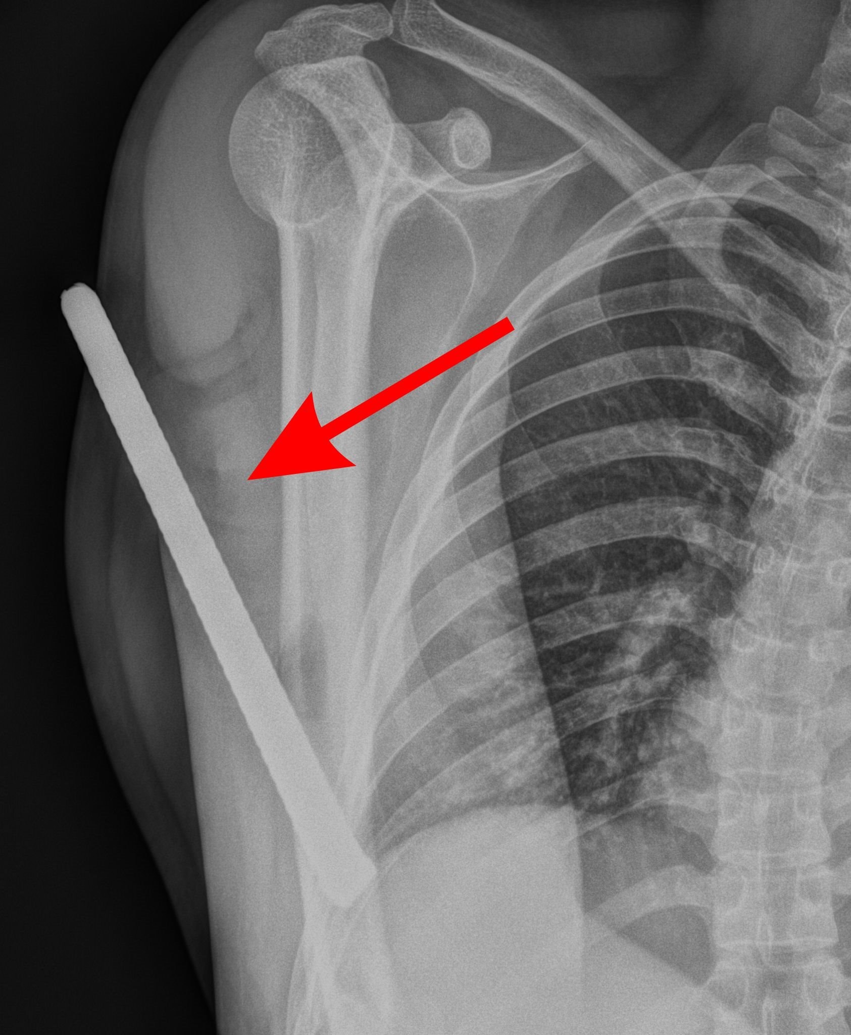 Tại đây, các bác sĩ ghi nhận dị vật xuyên từ mặt sau đầu trên cánh tay, chưa xác định được đầu còn lại.