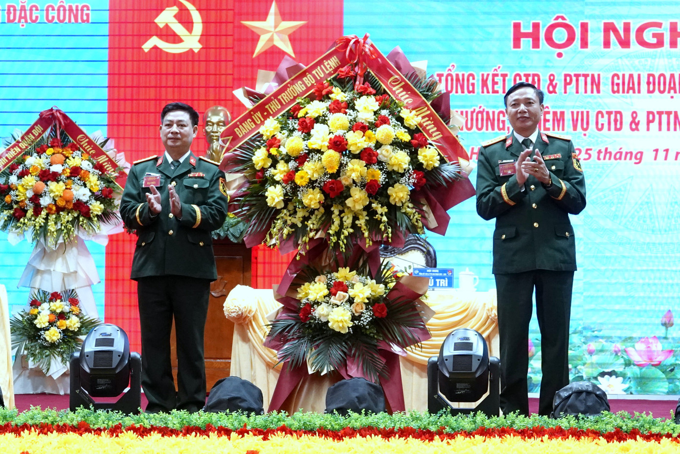 Lãnh đạo Binh chủng Đặc công, Ban Thanh niên Quân đội và Ban Phụ nữ Quân đội tặng hoa chúc mừng hai hội nghị.