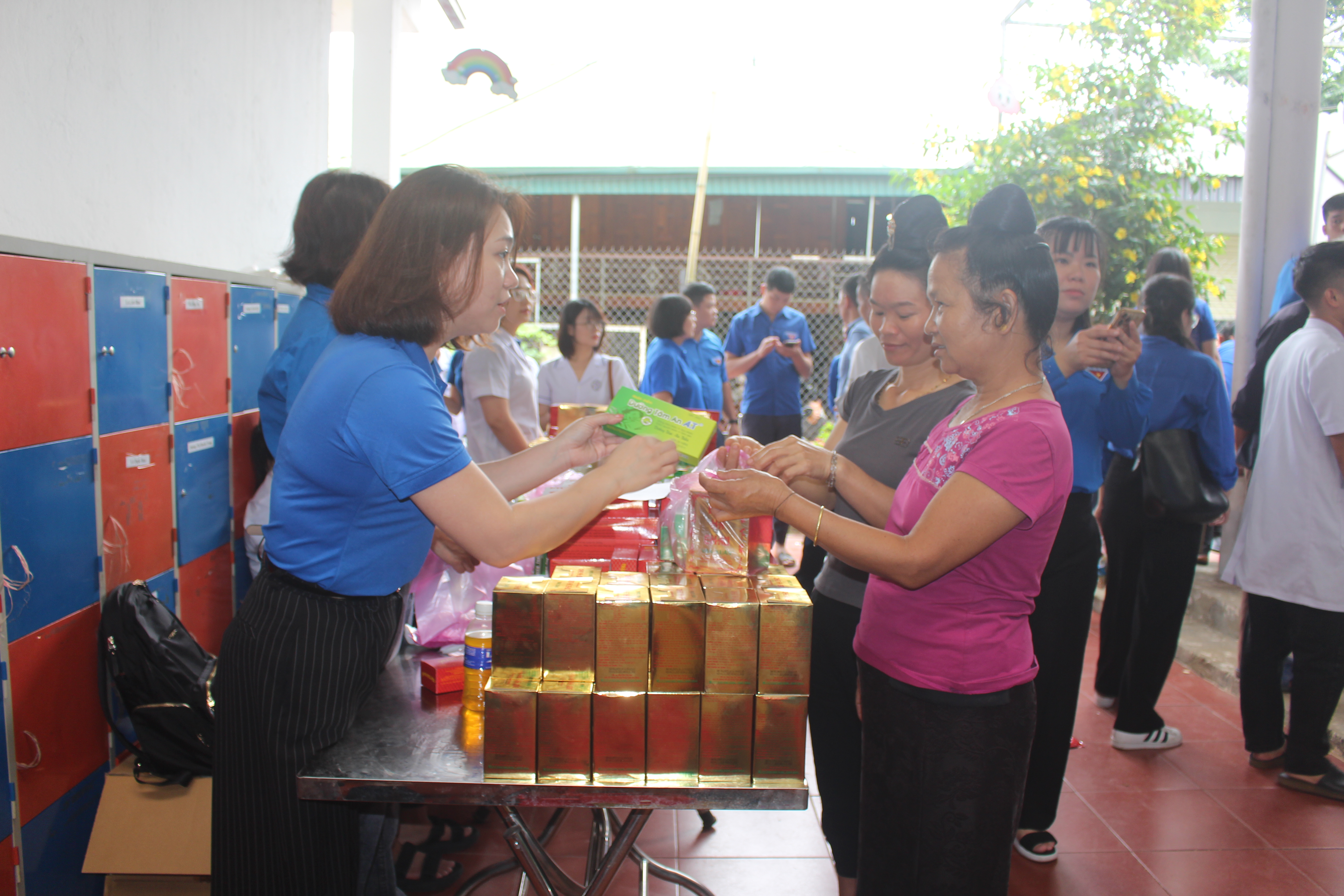 Đoàn viên, thanh niên phối hợp cấp phát thuốc miễn phí cho người dân xã Nà Tấu. Ảnh: Đức Linh