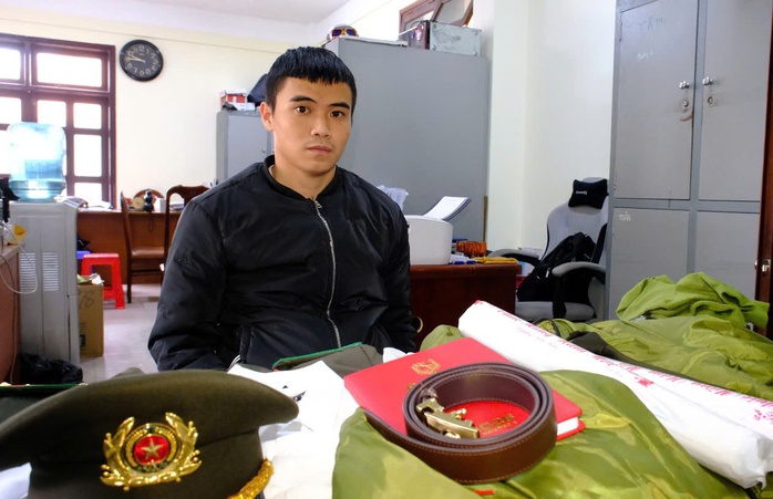 Thiện cùng tang vật là quần áo công an đặt trên mạng để thực hiện hành vi lừa đảo.