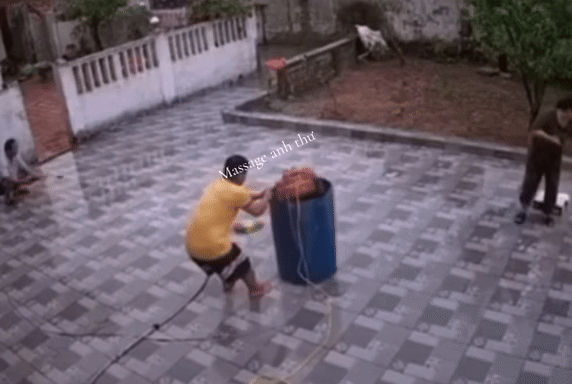 Chiếc máy rửa xe rơi xuống thùng phi nước, thanh niên đưa tay xuống liền bị điện giật. Ảnh cắt từ clip