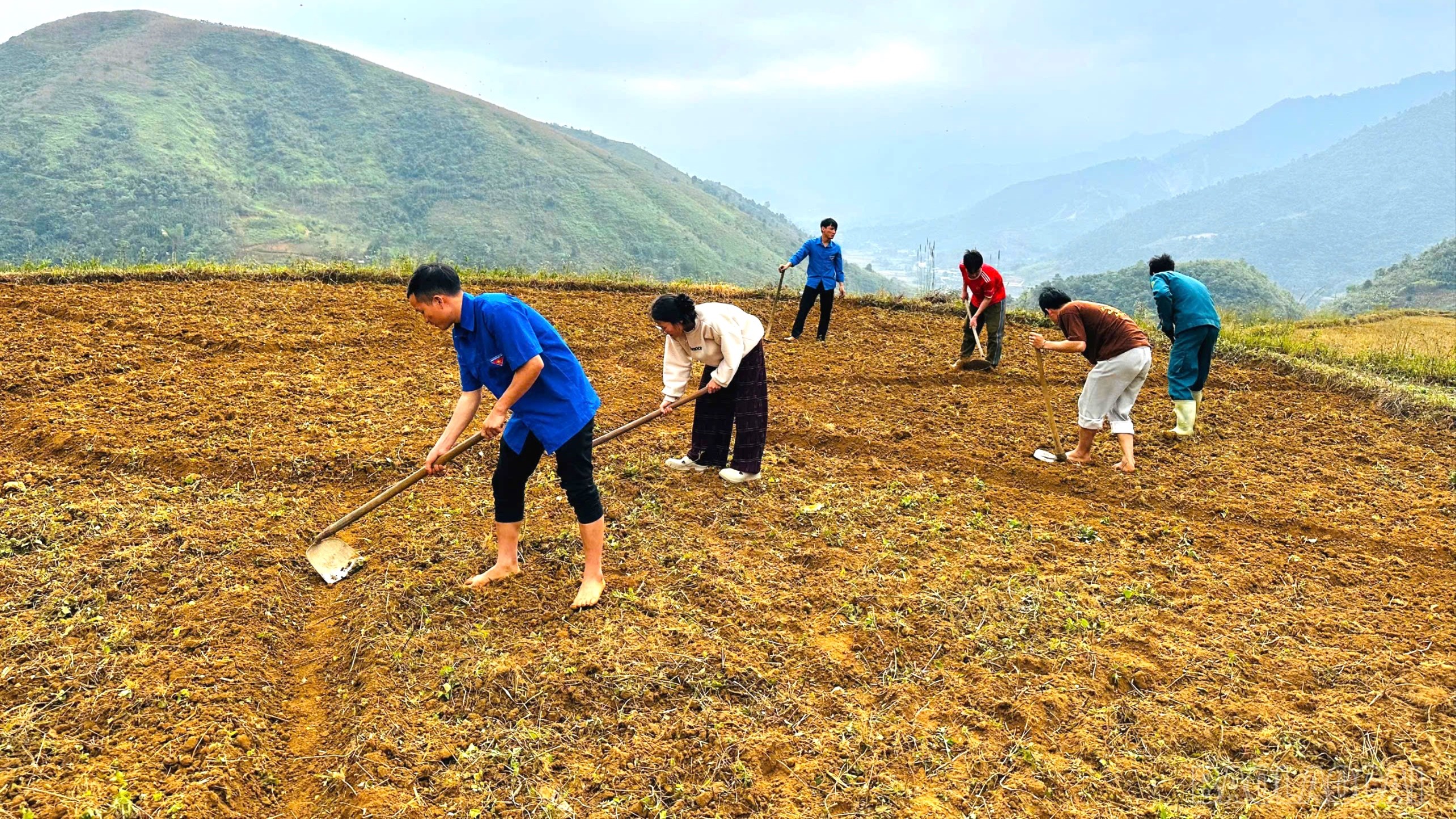 Đoàn viên, thanh niên xã Nậm Xé tham gia chung tay xây dựng nông thôn mới, cải tạo cánh đồng, trồng hoa trên đất ruộng.