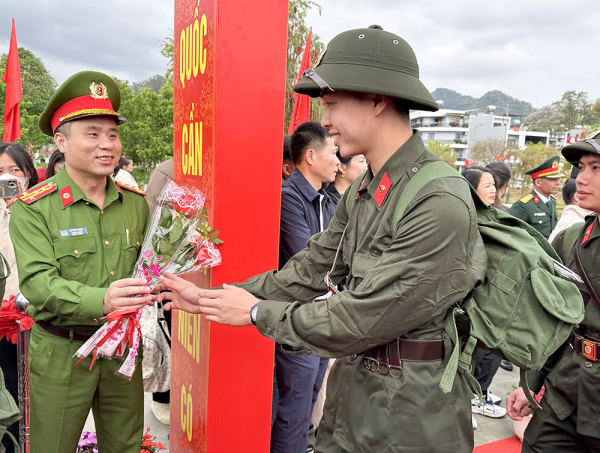 Đại tá Lê Đức Trung, Phó Giám đốc Công an tỉnh Sơn La tặng hoa các tân binh lên đường nhập ngũ.