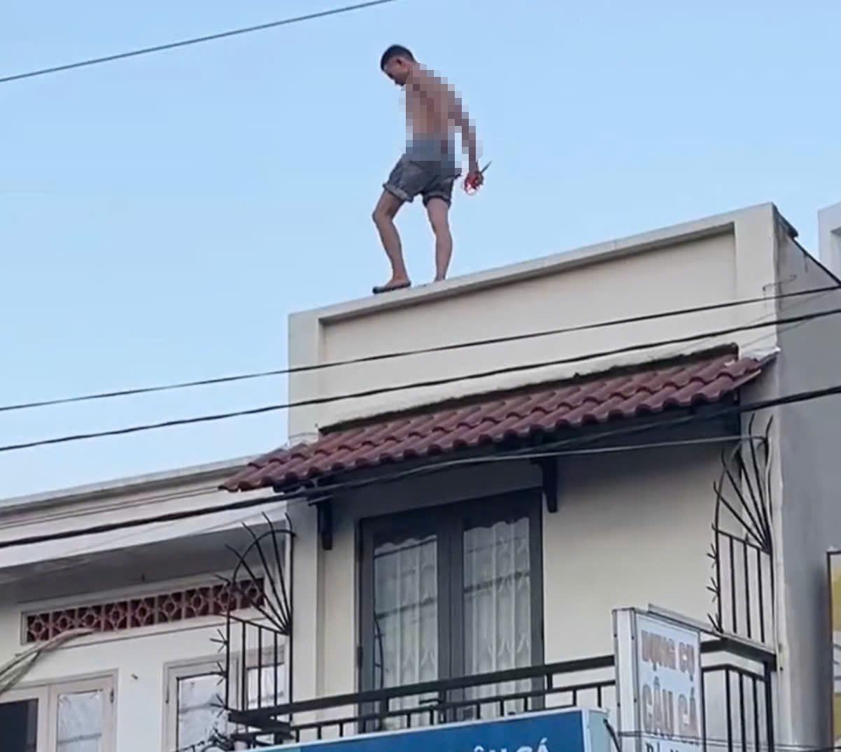 Nam thanh niên cố thủ trên mái nhà. Ảnh: H.T.