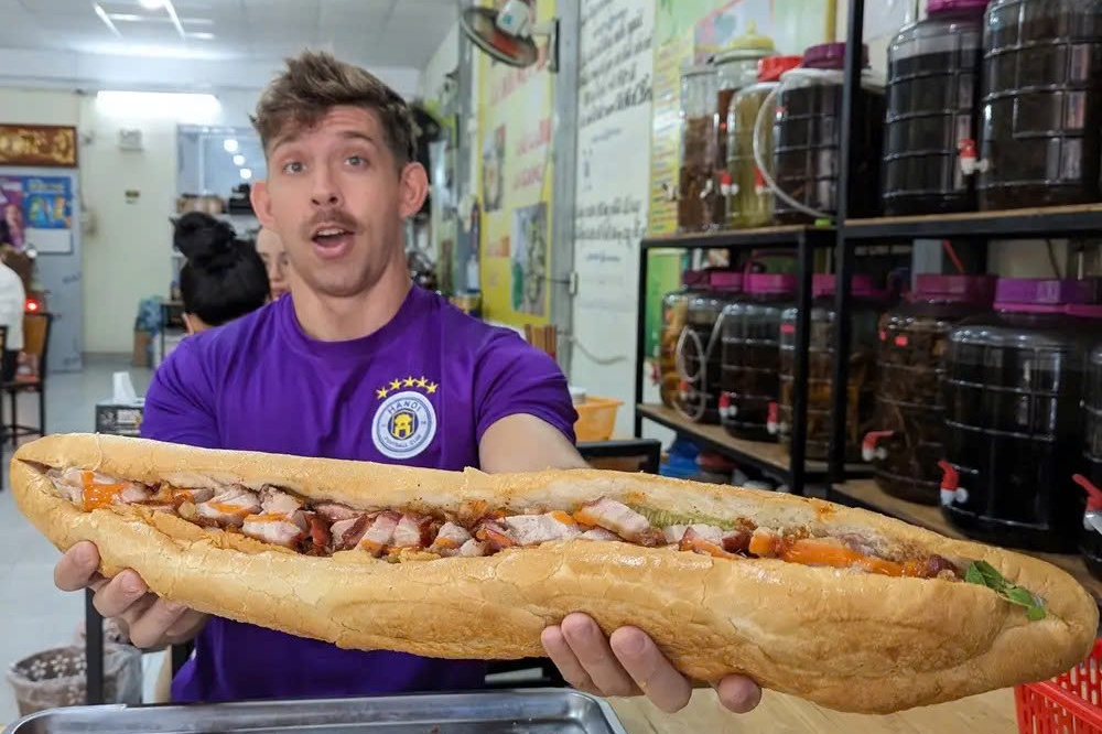 Travis thử bánh mì khổng lồ đẫm thịt.