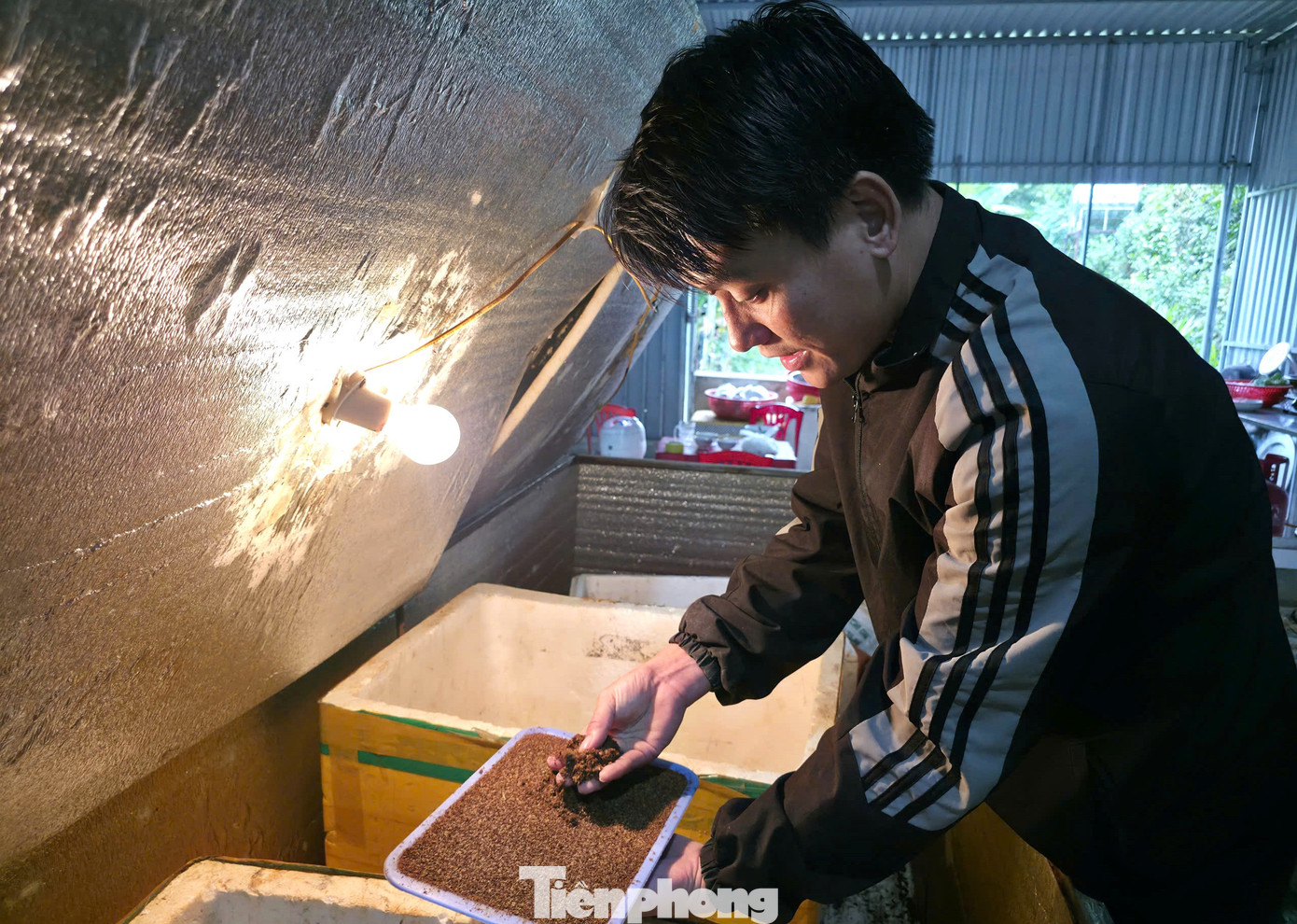 Anh Văn cẩn thận kiểm tra từng chuồng nuôi dế để đảm bảo môi trường, nhiệt độ phù hợp để dế phát triển tốt.