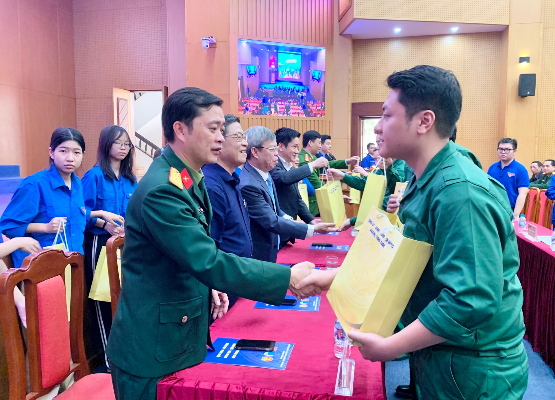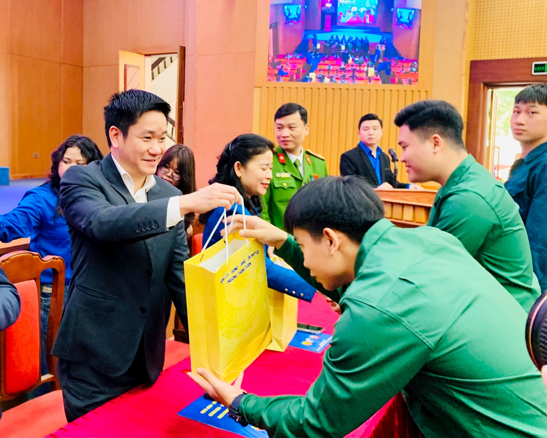 Lãnh đạo tặng quà cho thanh niên nhập ngũ. Ảnh: Hồng Thái