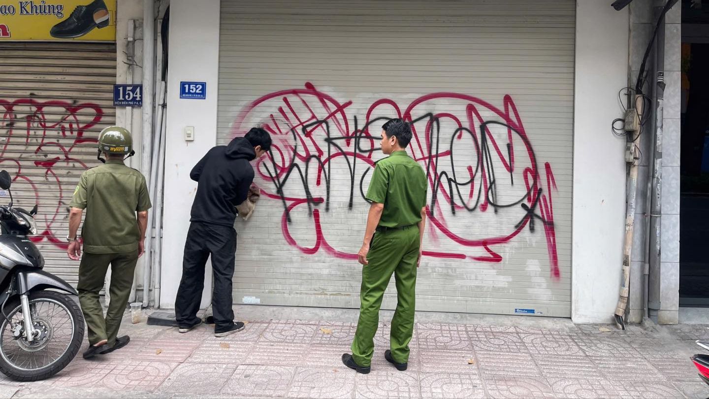 Công an xác định Khôi đã vẽ bậy lên cửa cuốn nhà dân trên đường Điện Biên Phủ. Ảnh: CA