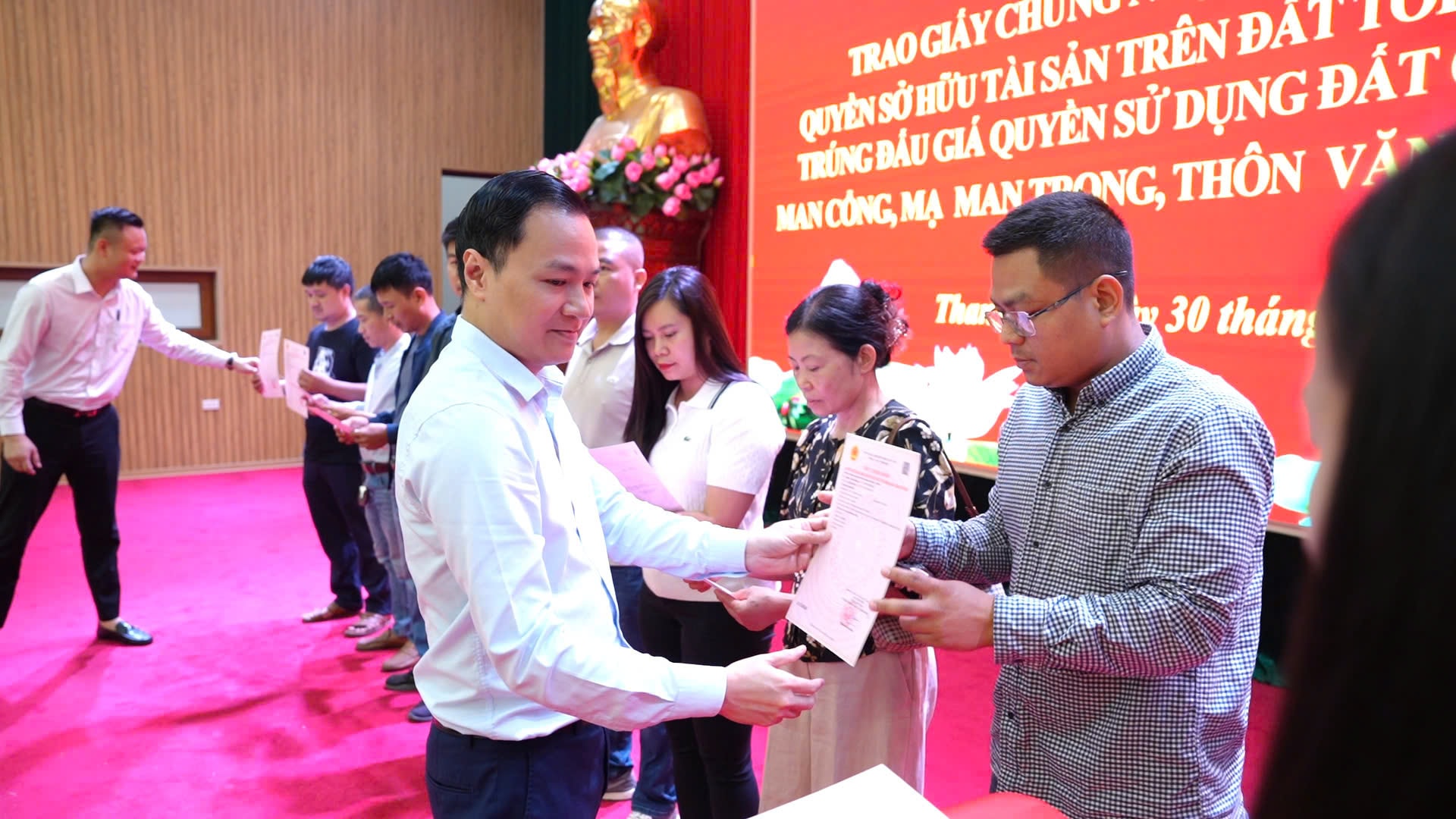 Bí thư Đảng ủy xã Thanh Oai Bùi Hoàng Phan trao giấy chứng nhận quyền sử dụng đất, quyền sở hữu tài sản cho các khách hàng trúng đấu giá quyền sử dụng đất. Ảnh: Nguyễn Lý